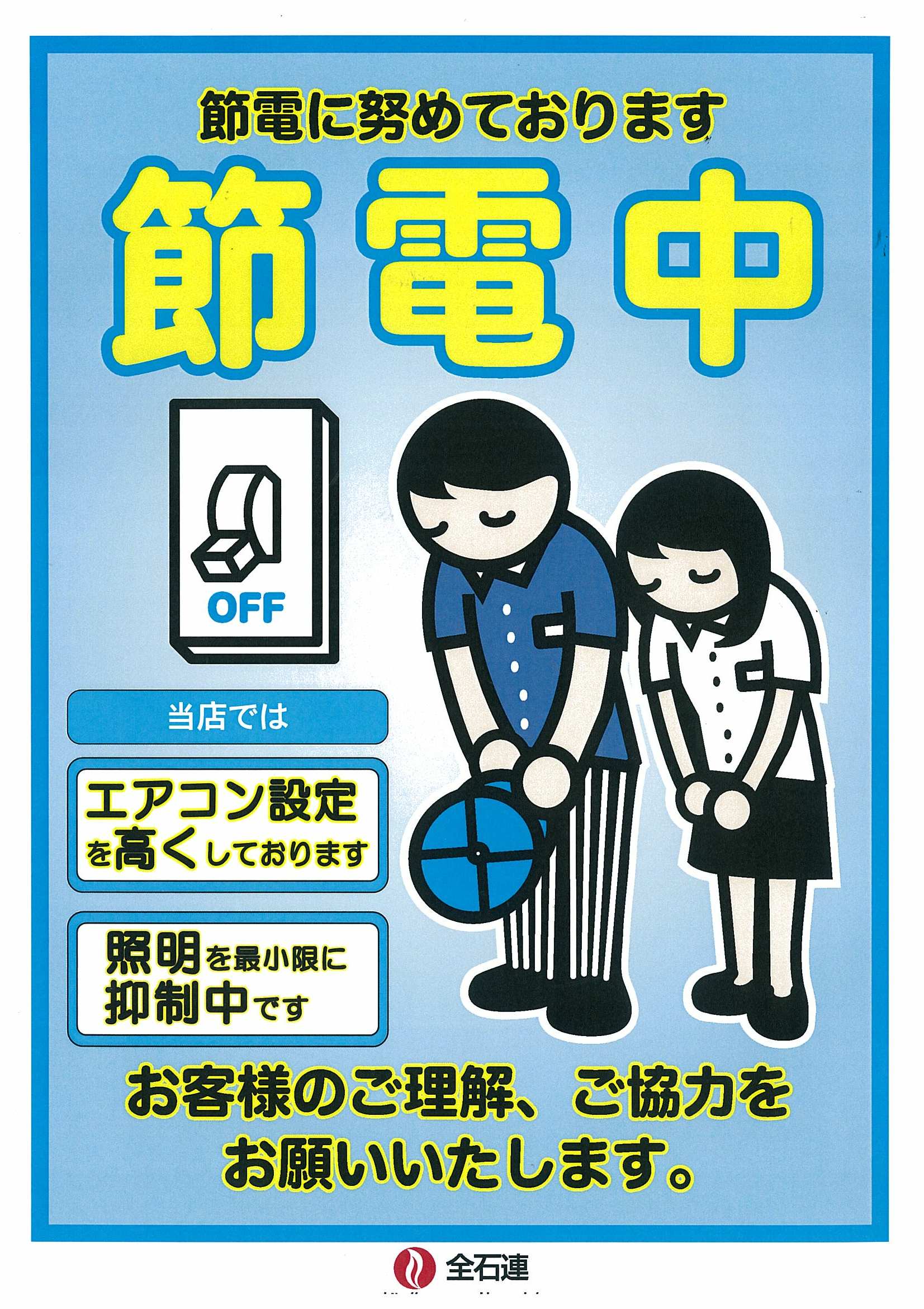 弊社では昨年に続き今年も弊社の業界団体である石油連盟、全石連の要請により、そして夏場の電力需要の逼迫を考慮して、全営業所で節電活動に取りくませて頂きます。