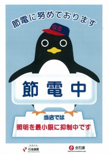 勿論、危険物を取り扱う営業所も多いガソリンスタンドでは安全には最大の配慮をして節電に取り組んでまいりますので、ご理解を賜りますよう何卒よろしくお願いします。