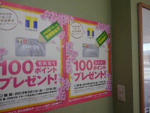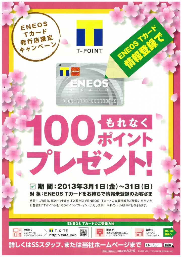 弊社「ENEOS」のサービスステーションでは’13年3月1日から3月31日まで、期間中ENEOSのTカードの会員情報を登録して頂くと100ポイントのプレゼントキャンペーンに参加しています。