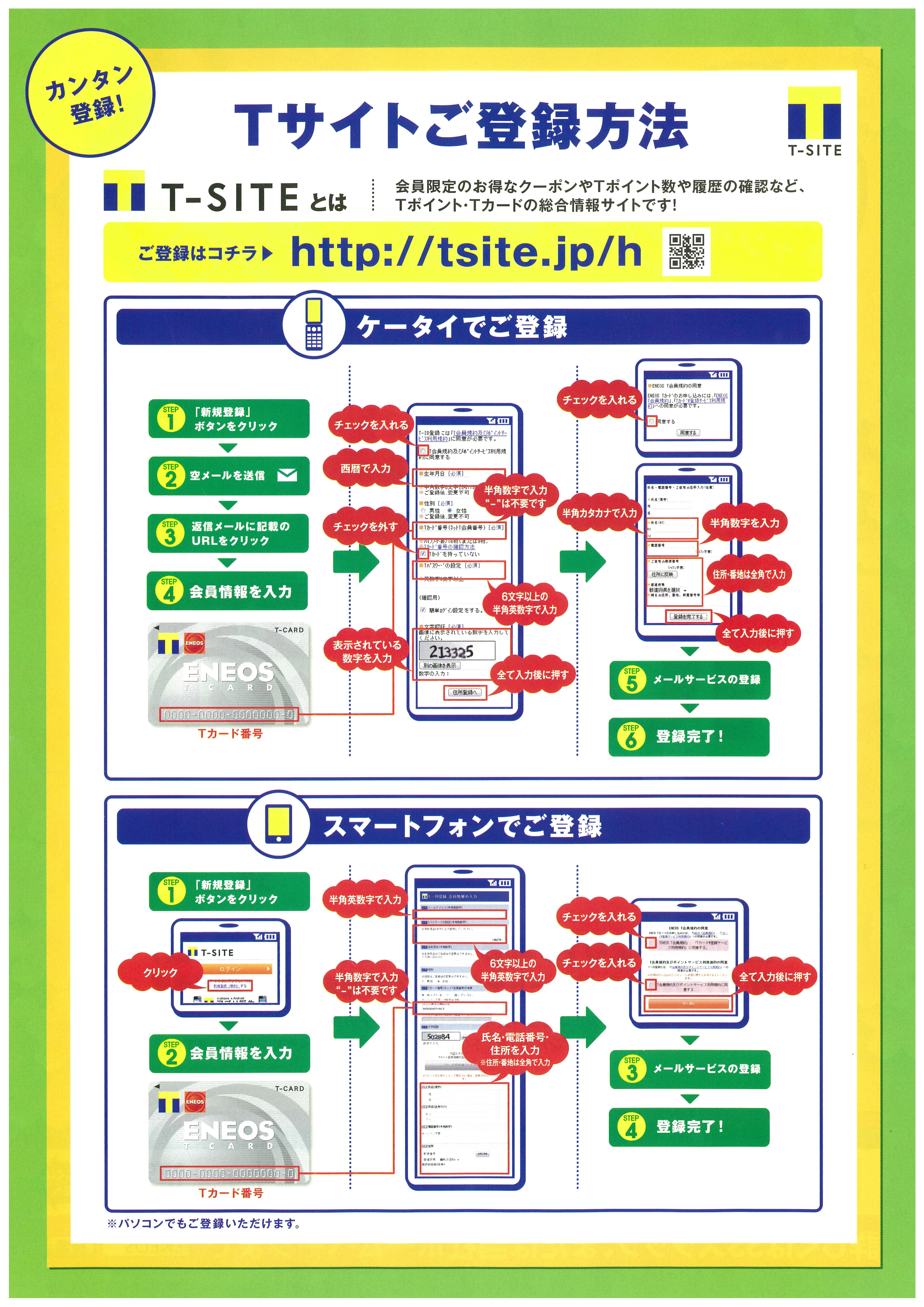 ENEOS Tカードは弊社6店舗で無料で発券していますが、お客様にご登録を戴かないとTポイントが貯まりません。