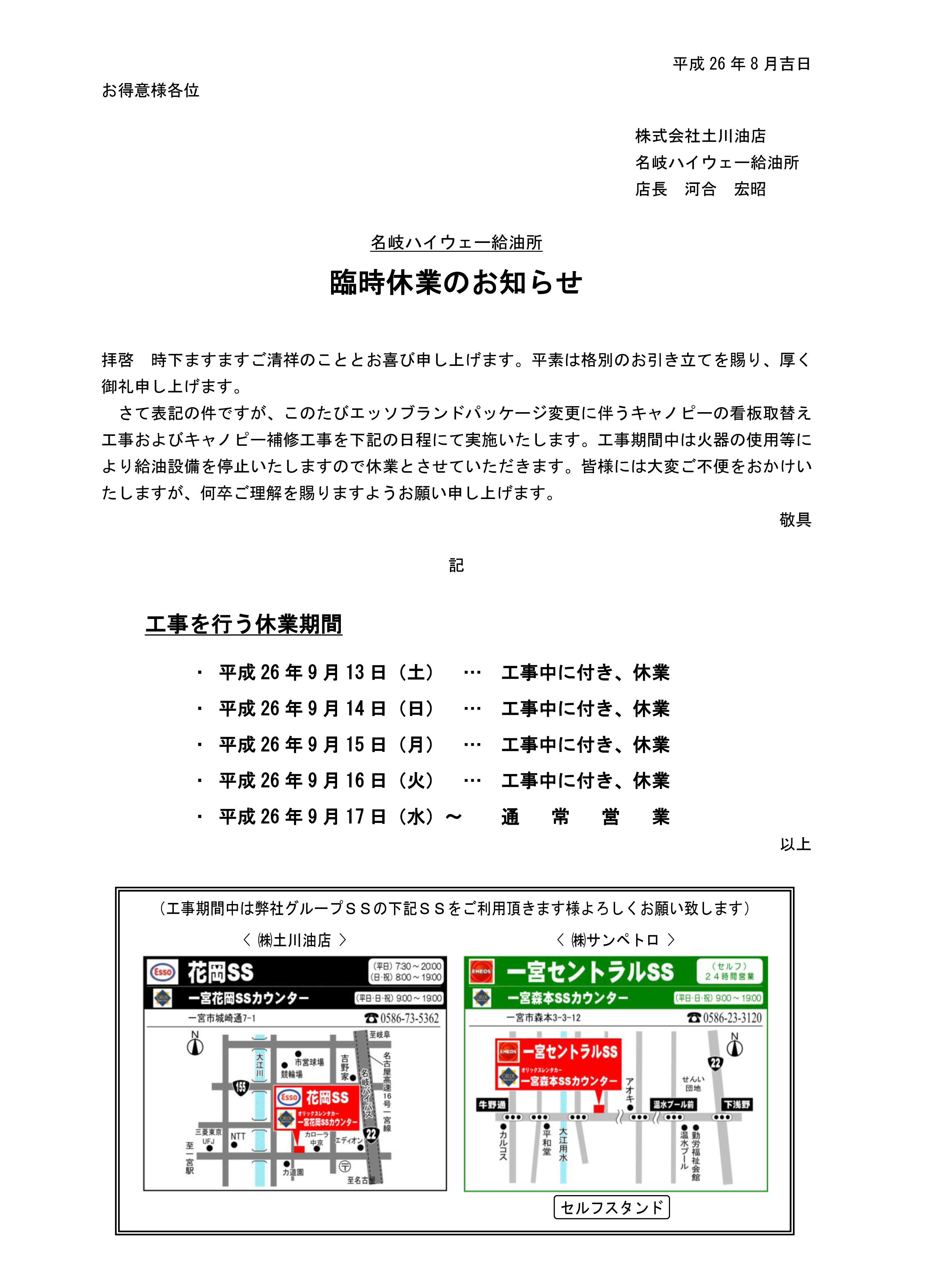 工事期間中は大変ご迷惑をおかけしますが、近隣の弊社サービスをご利用ください。