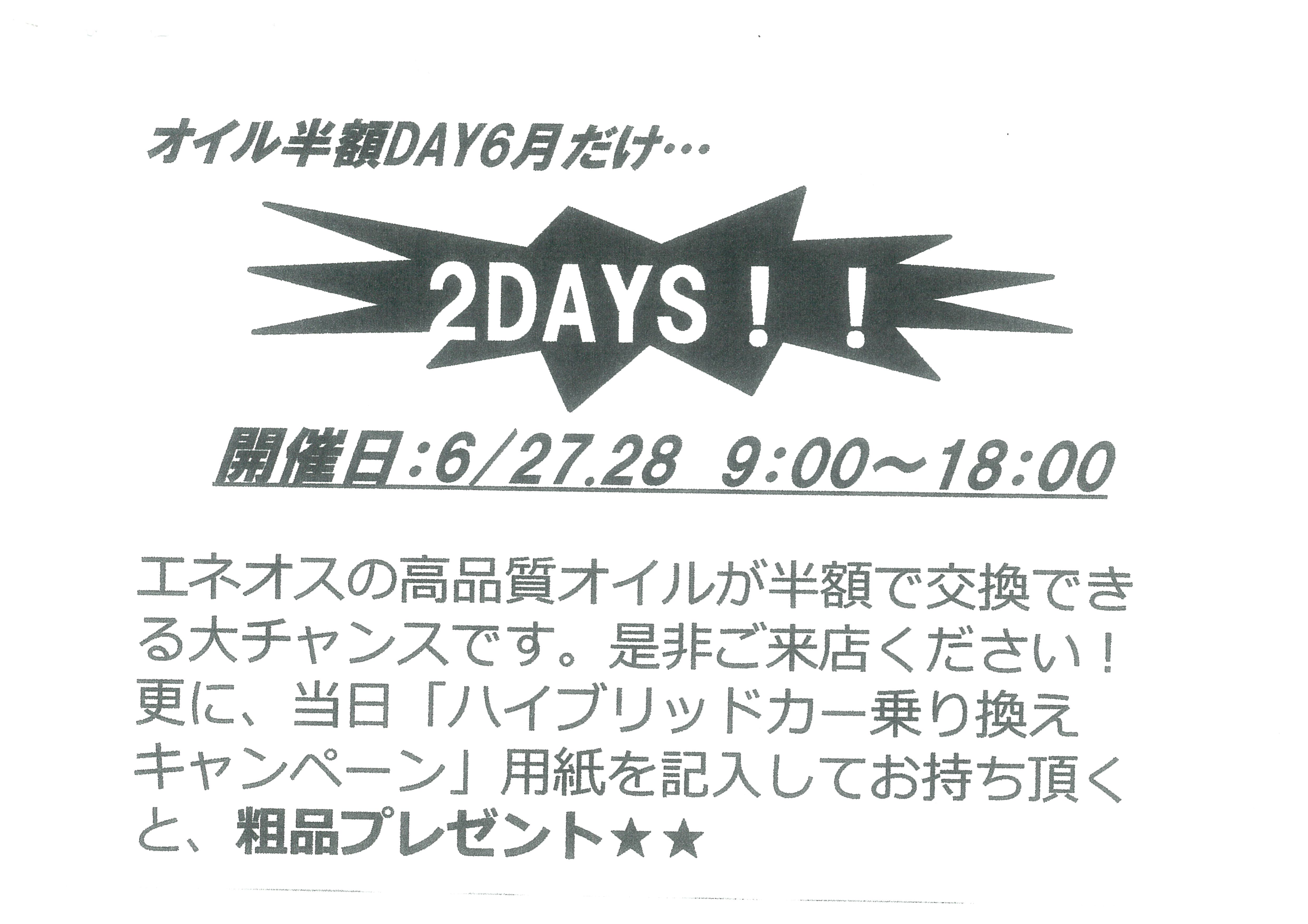 一宮東サービスステーション(ENEOS/一宮市浅野水屋高)では6月27日(土)28日(日)と「お車商談会」と「オイル半額DAY」を実施いたします。