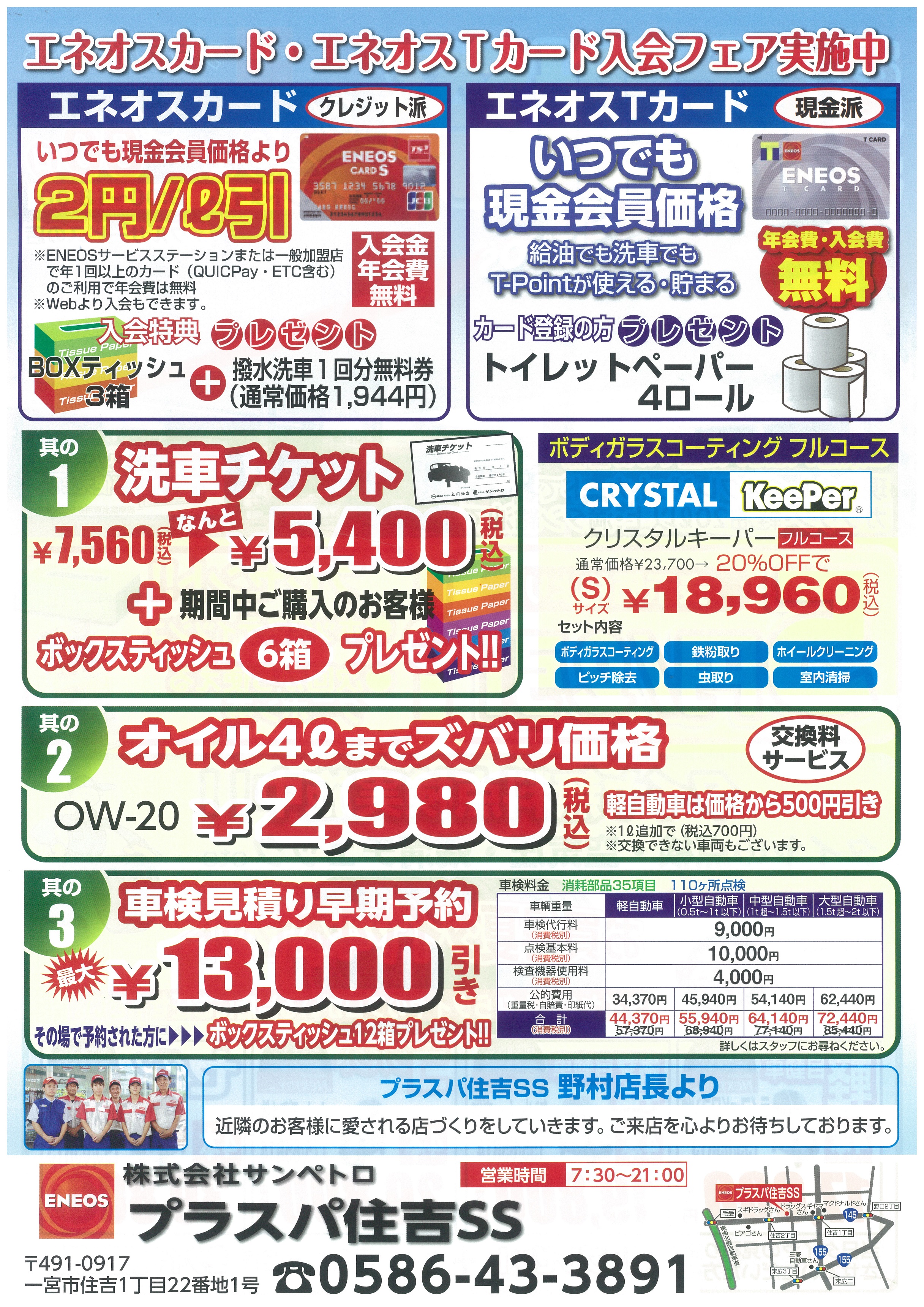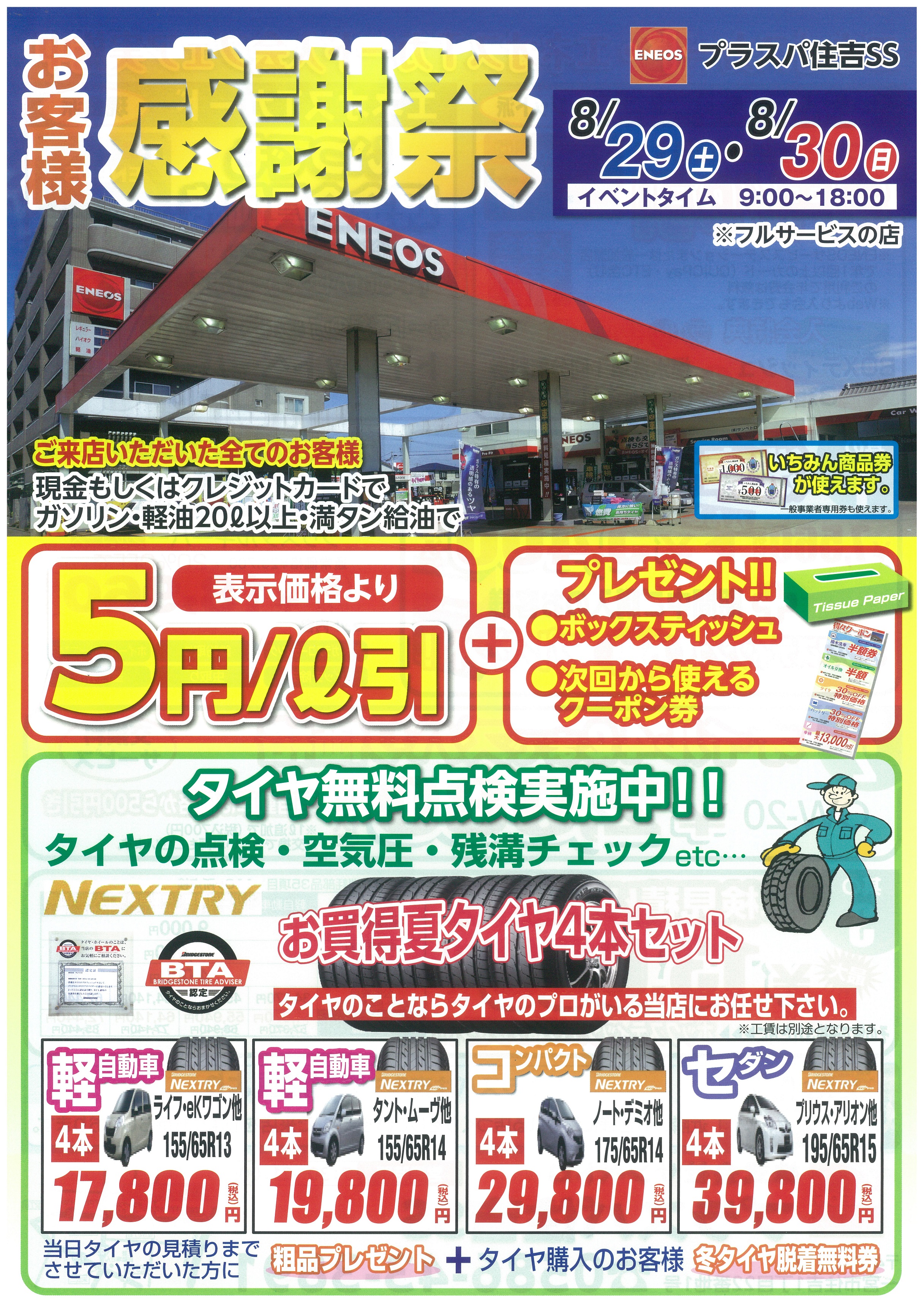 プラスパ住吉サービスステーション(ENEOS/一宮市住吉1)では8/29(土)30(日)とお客様感謝祭を開催します。