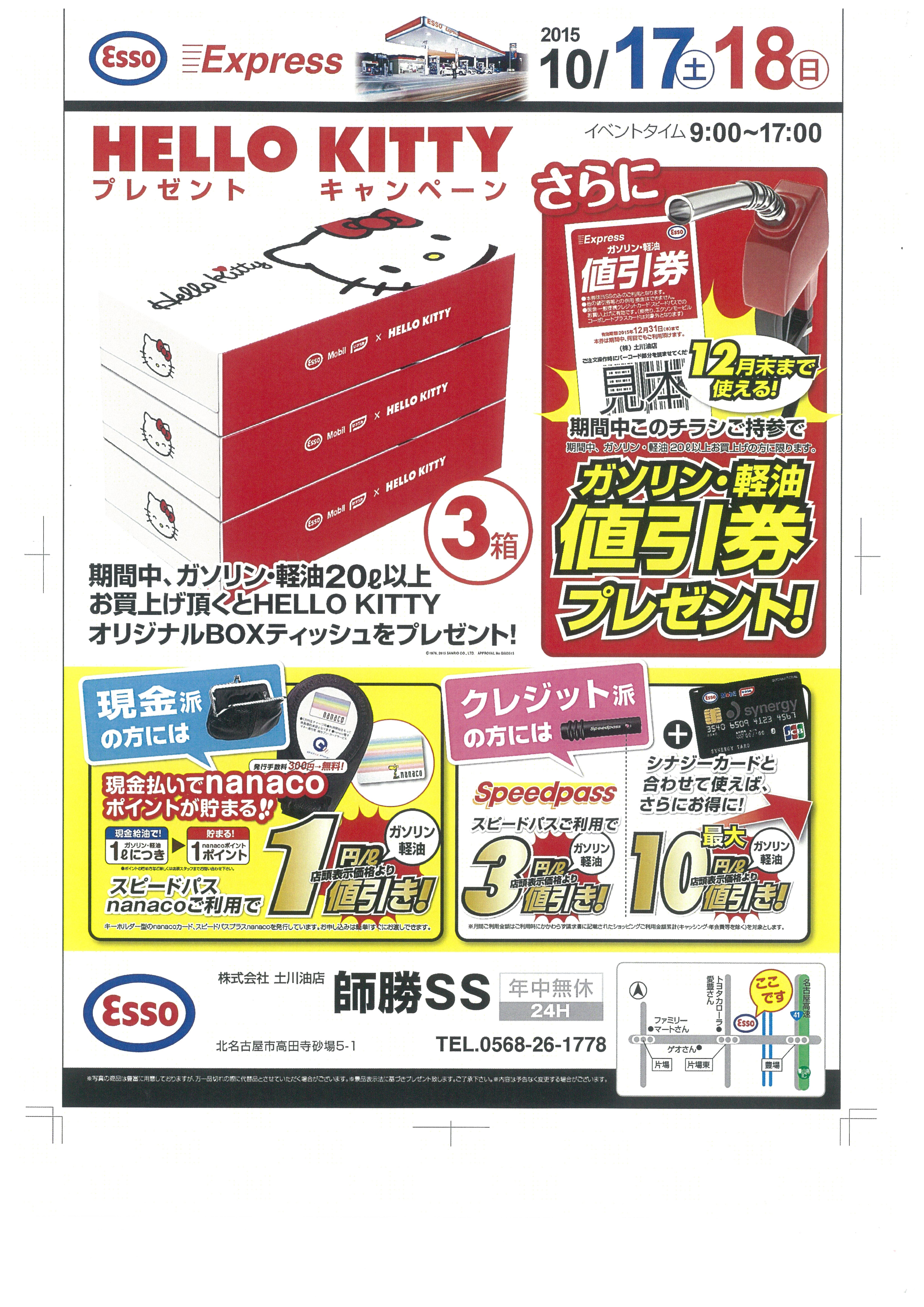 師勝サービスステーションでは10月17(土)18(日)日「HELLO KITTYプレゼントキャンペーン」として限定ボックスティッシュをプレゼントするキャンペーンを開催します。