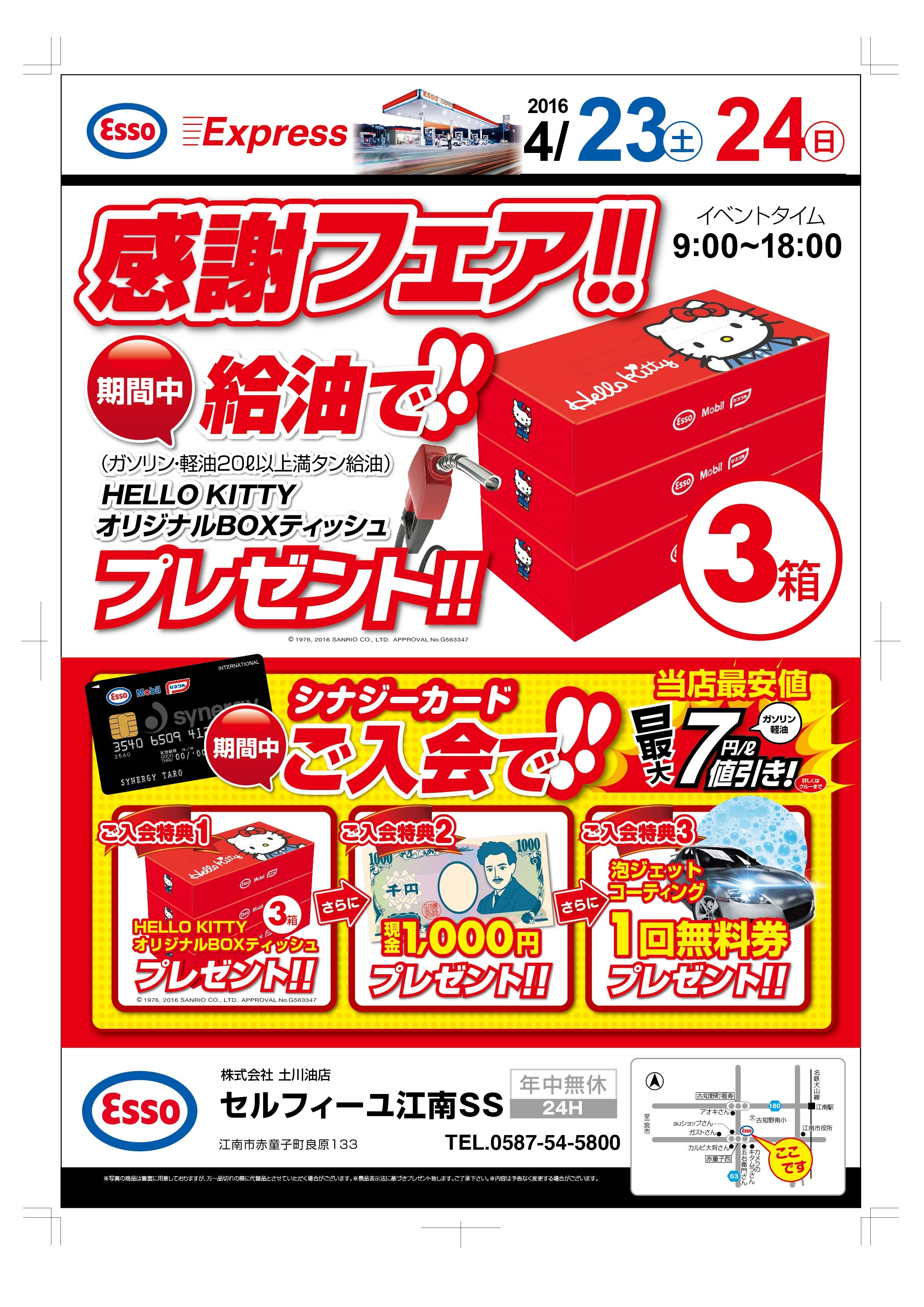 セルフィーユ江南サービスステーション(ESSO/江南市赤童子町良原133)では「感謝フェア」と題し4/23(土)24(日)と下の案内の通りHELLO KITTYオリジナルボックスティッシュ3箱をプレゼントするイベントを開催します。