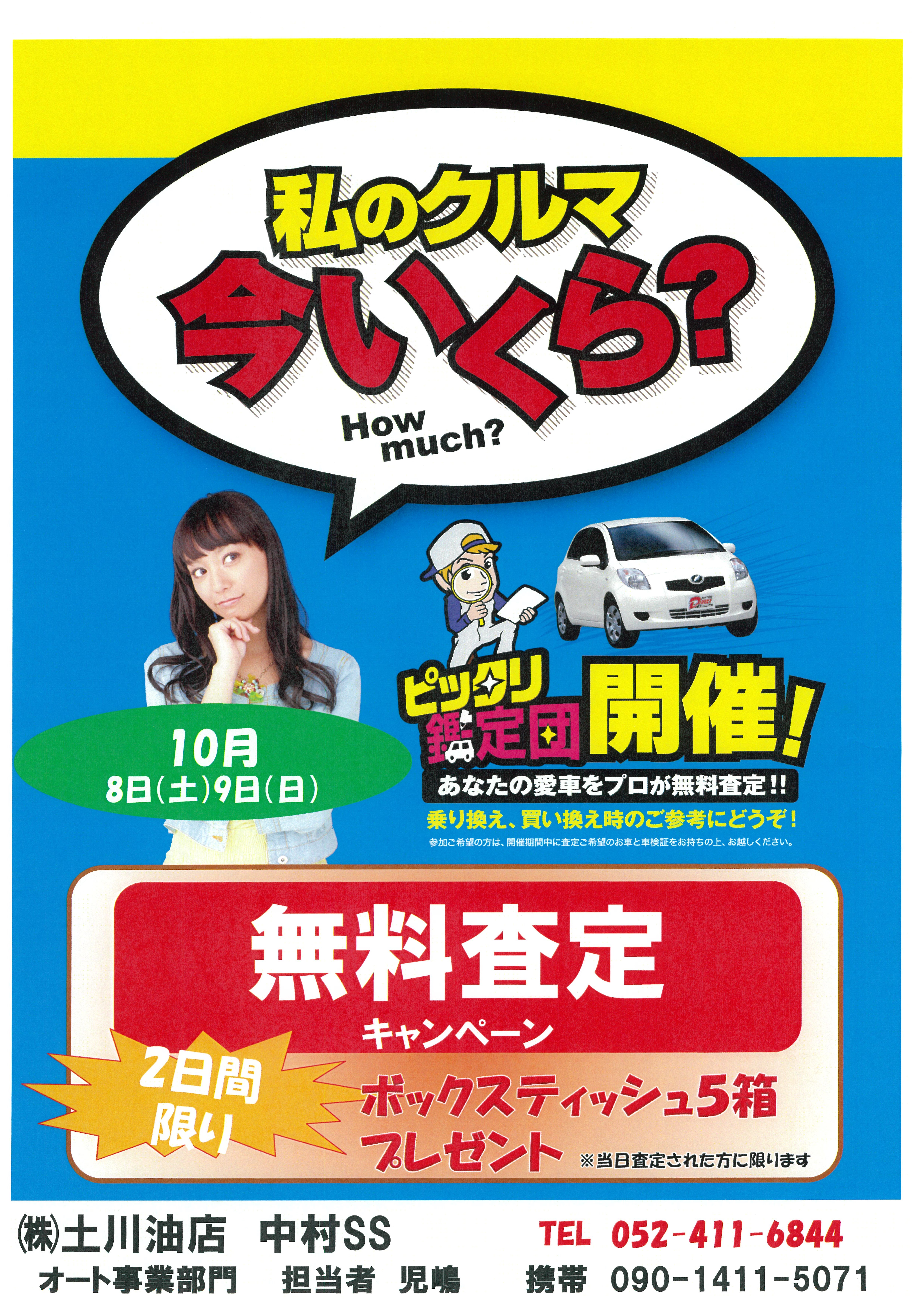中村サービスステーション(ESSO/名古屋市中村区鳥居西通り2)では10/8(土)・10/9(日)とお車の無料査定会を開催します。