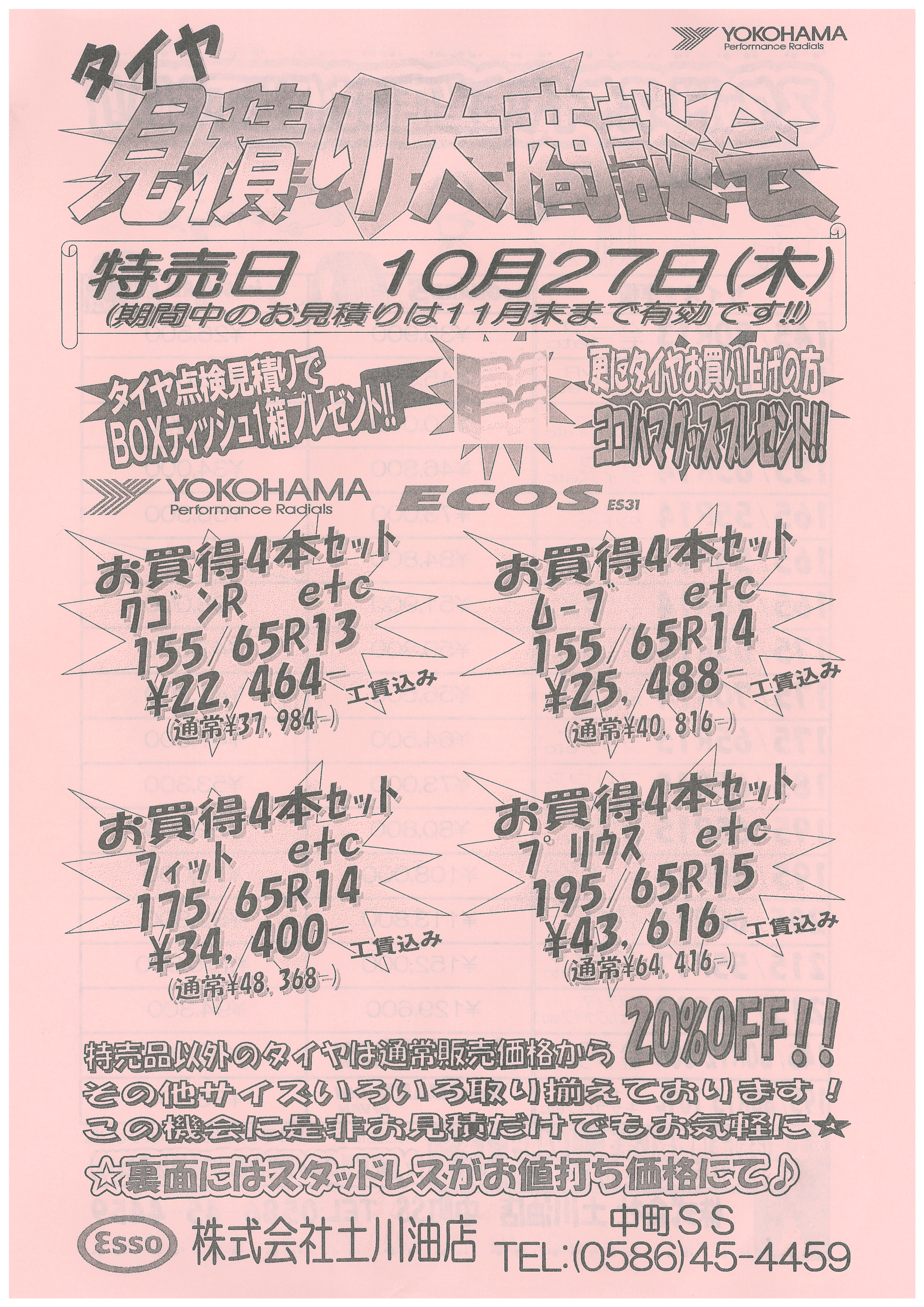 中町サービスステーション(ESSO/一宮市中町2-4-8)では10/27(木)「タイヤ見積もり大商談会」を開催します。