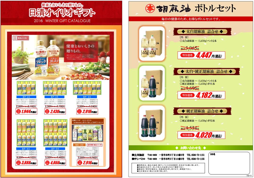 マルホン胡麻油 ギフトセットと日清オイリオギフトセットのちらしです。