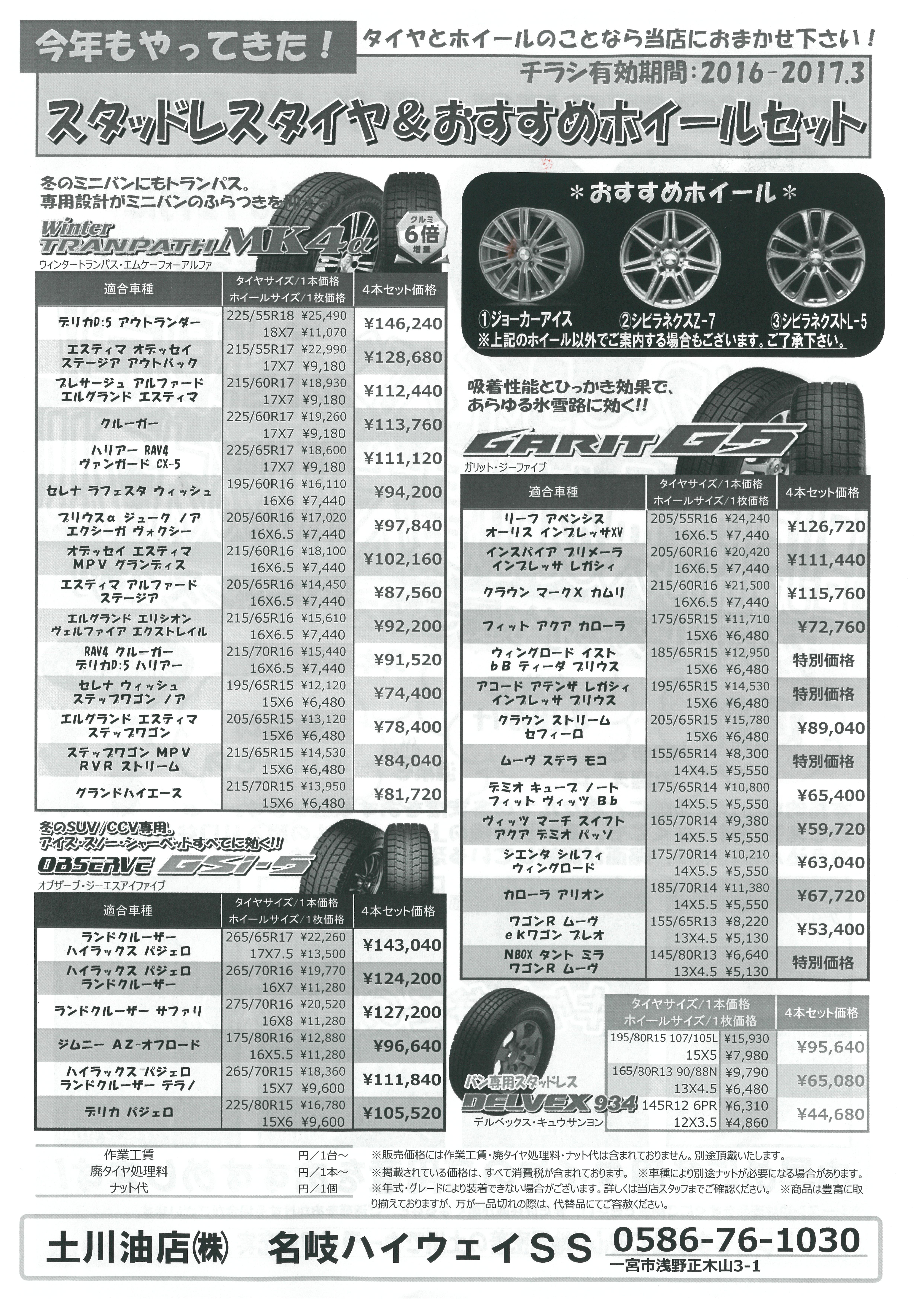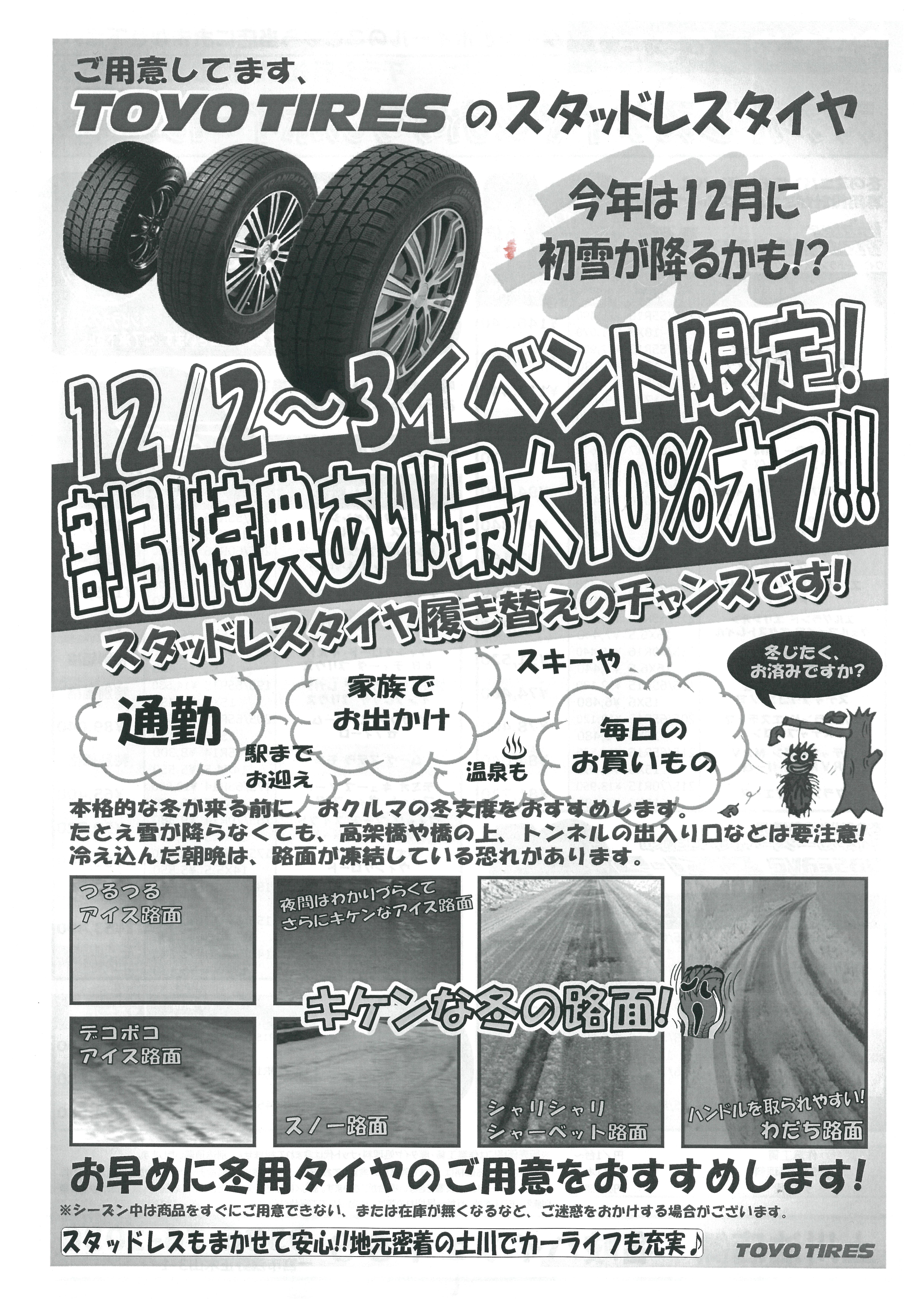 当日はTOYOタイヤ様にご協力いただきまして、お得な価格でスタッドレスタイヤを販売させていただきます。