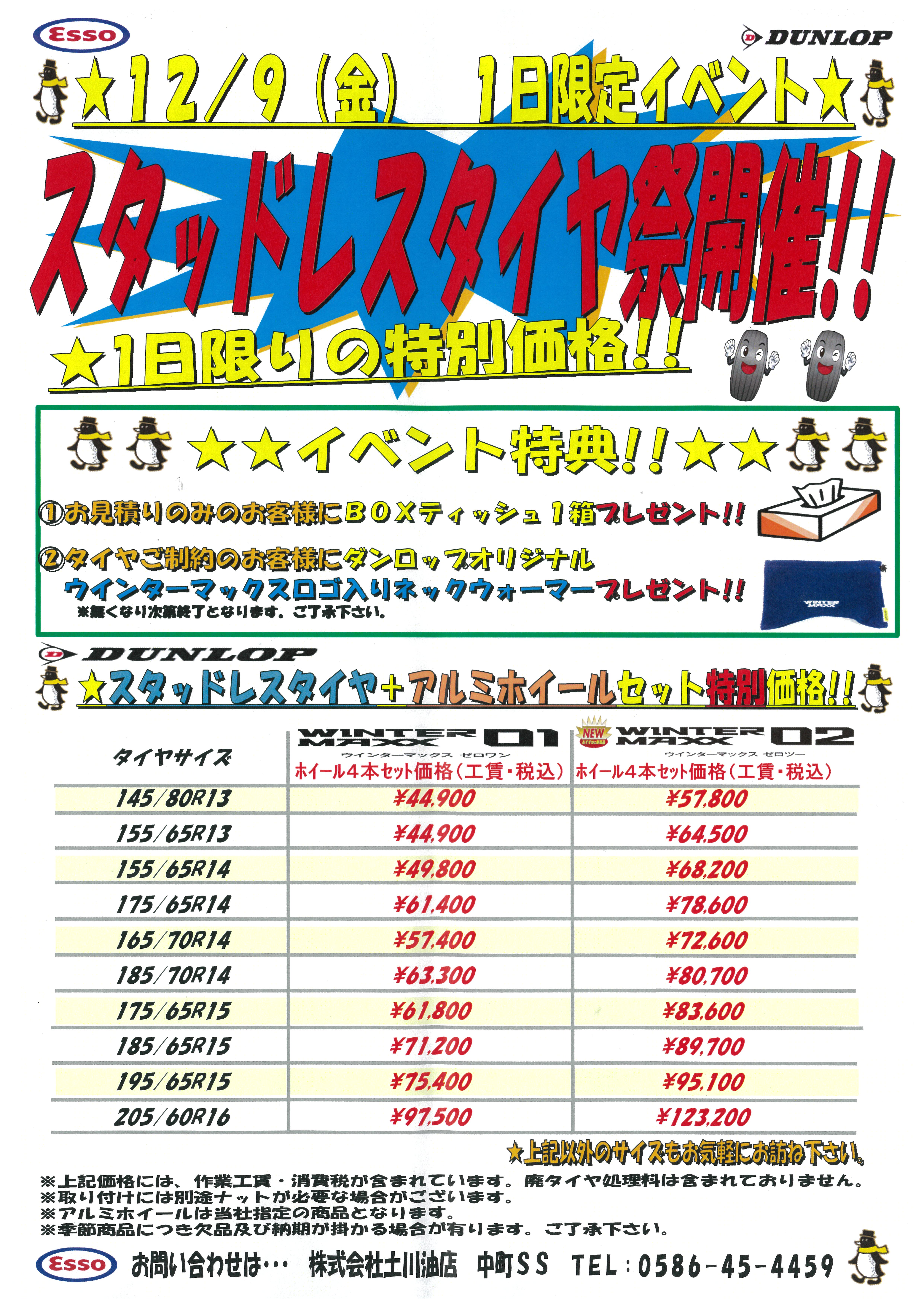 中町サービスステーション(ESSO/一宮市中町2-4-8)では「スタッドレスタイヤ祭り」を12/9(金)に開催します。