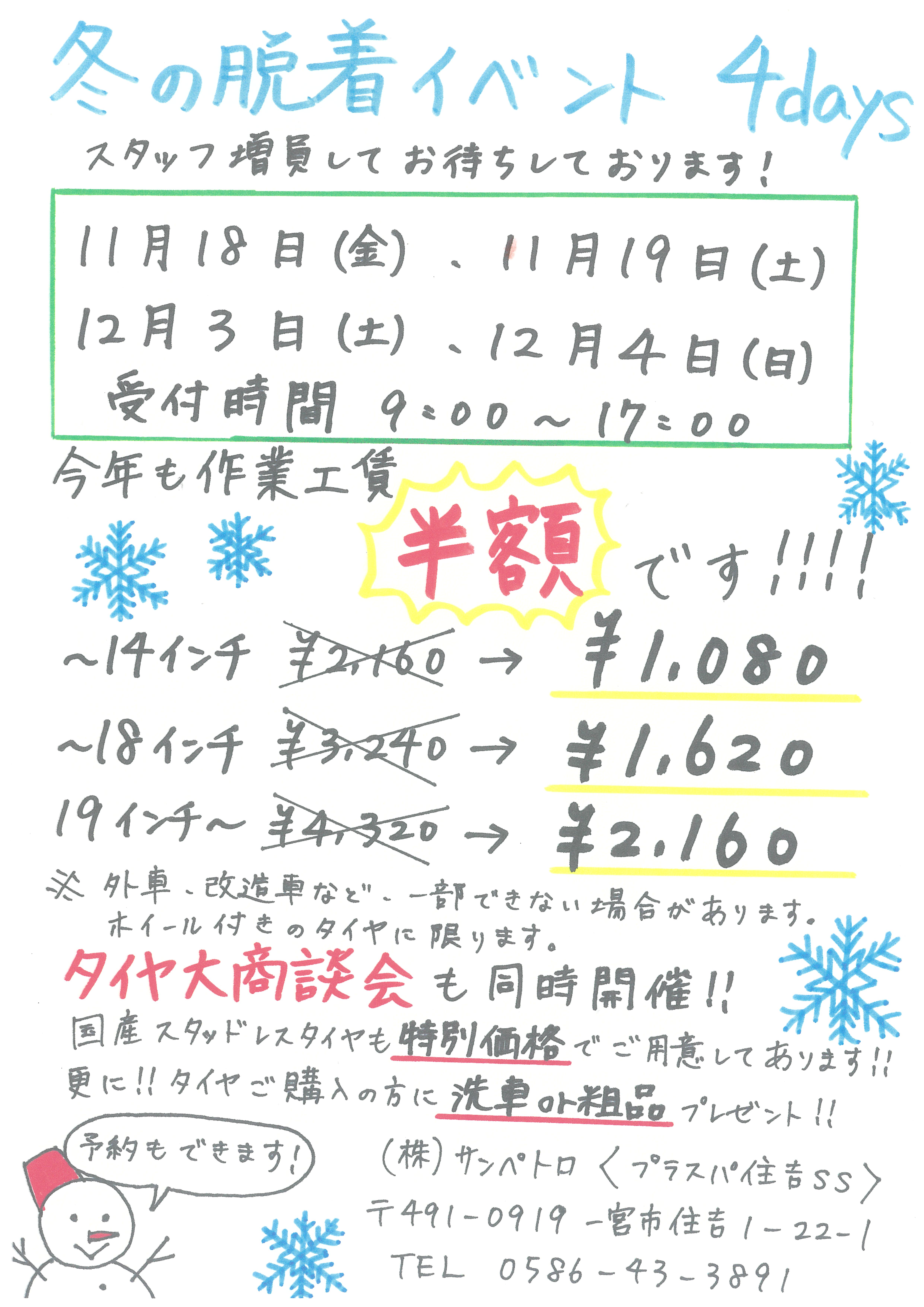[プラスパ住吉サービスステーション]冬のタイヤ脱着イベントのご案内(11/18・19 12/3・4)