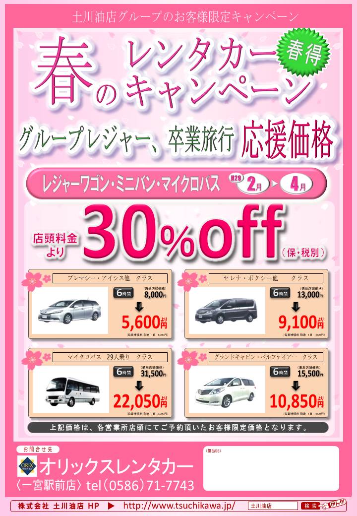 [オリックスレンタカー一宮営業所]「春のレンタカーキャンペーン」のご案内(~4/30)