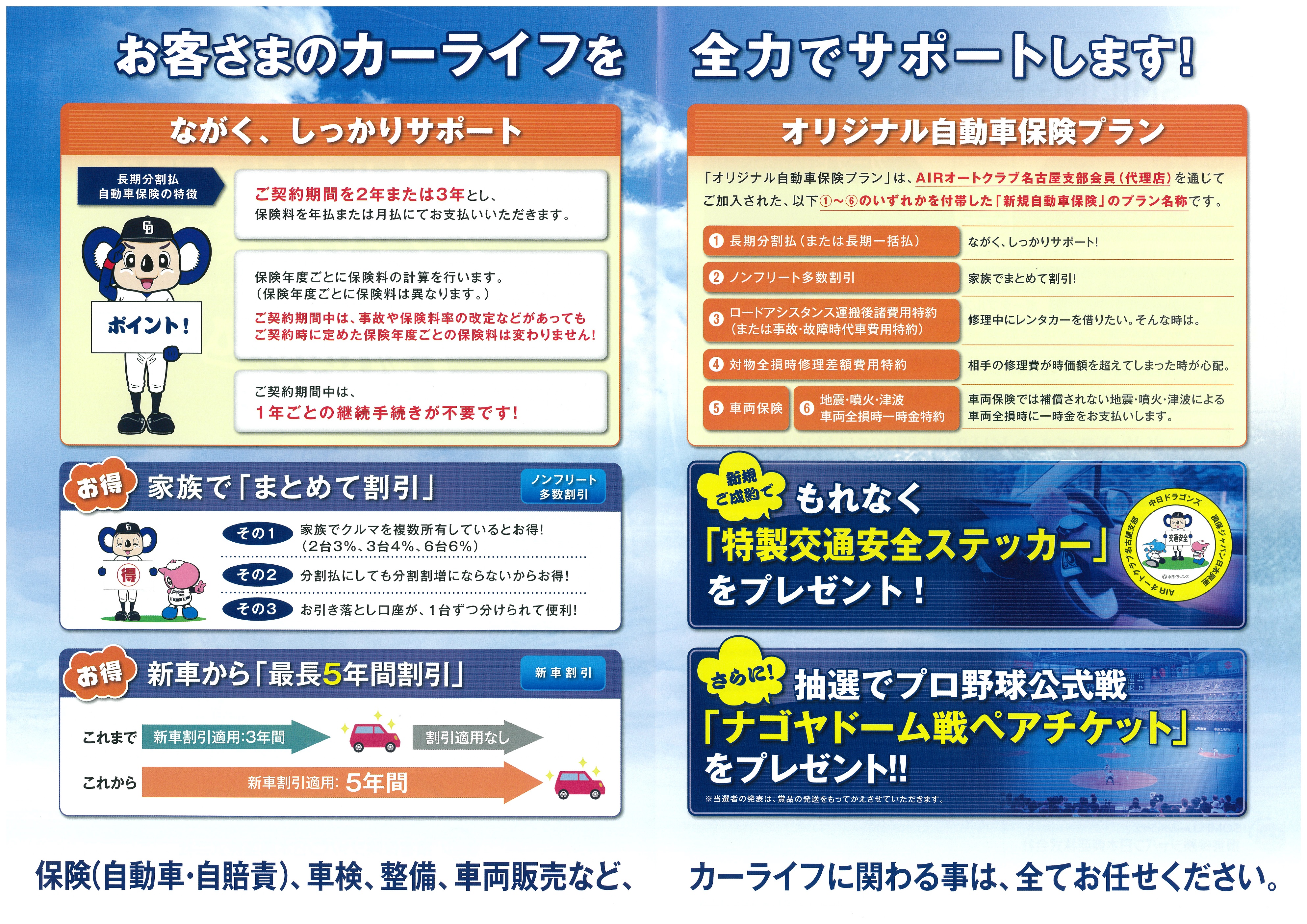 AIRオートクラブ名古屋支部会員の代理店である私どもを通して、裏にあります①~⑥を付帯した「新規自動車保険」を契約していただきますと