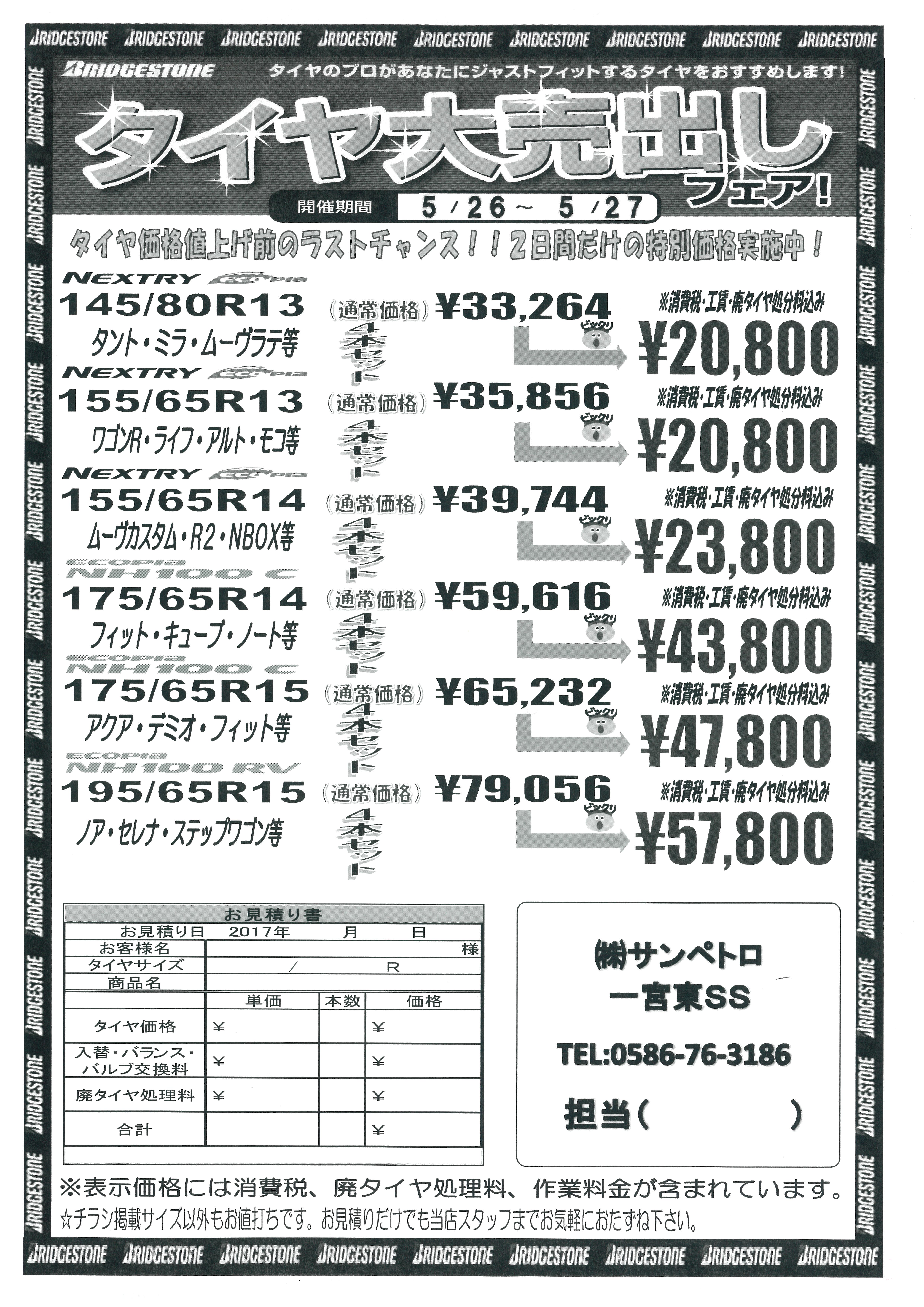 一宮東サービスステーション(ENEOS/一宮市大字浅野字水屋高9-1)では「タイヤ大売出しフェア」と題し5/26(金)27(土)下の案内の通りタイヤのイベントを行います。