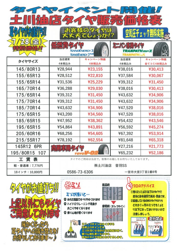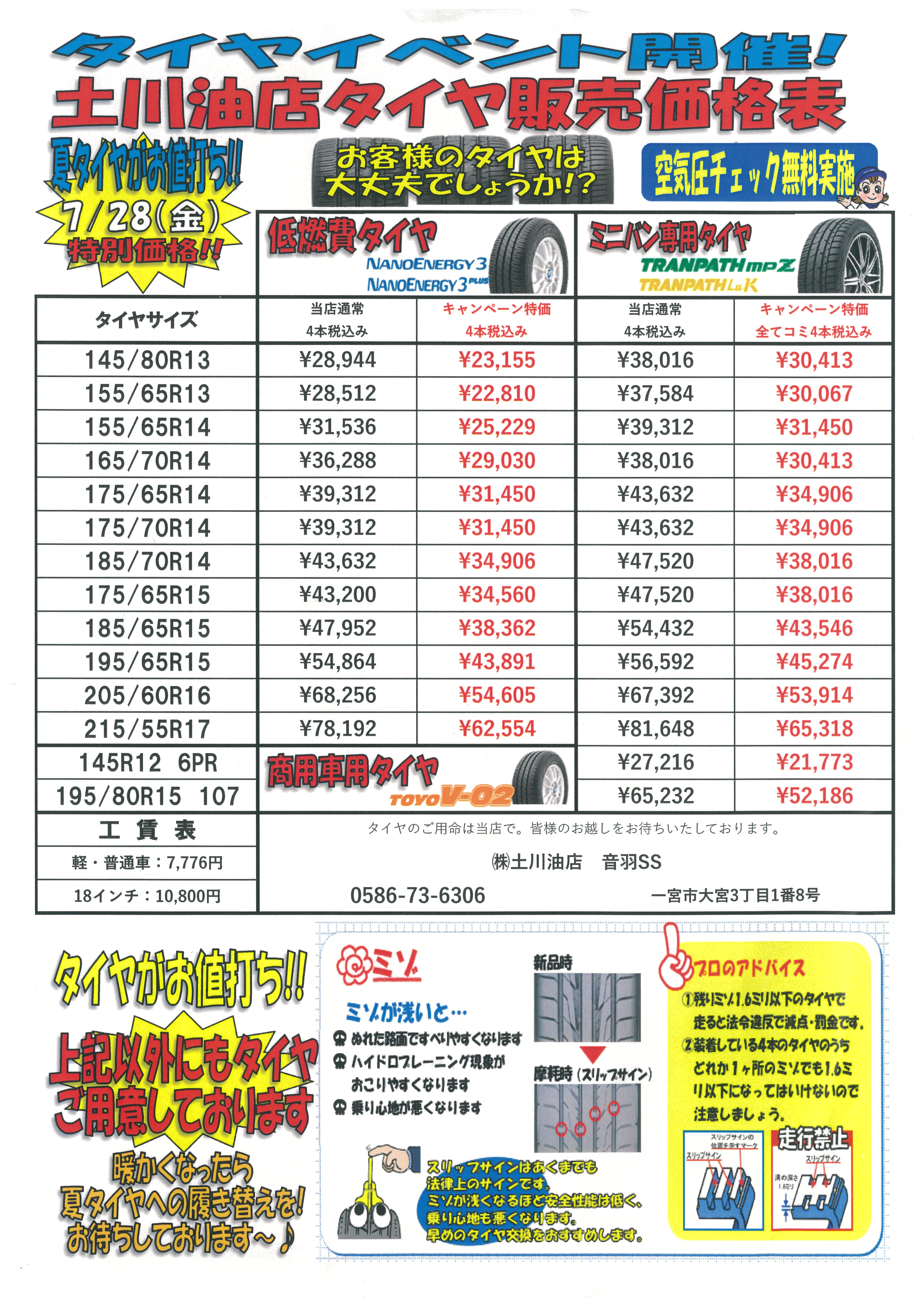 音羽サービスステーション(ESSO/一宮市大宮3-1-8)では7/28(金)タイヤイベントを開催します。