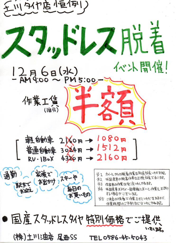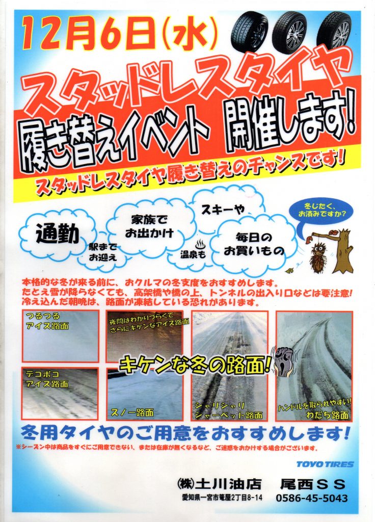 尾西サービスステーション(ESSO/一宮市篭屋2-8-14)では12/6(水)「スタッドレスタイヤ脱着イベント」と題し夏タイヤから冬タイヤへの作業工賃半額イベントを開催します。