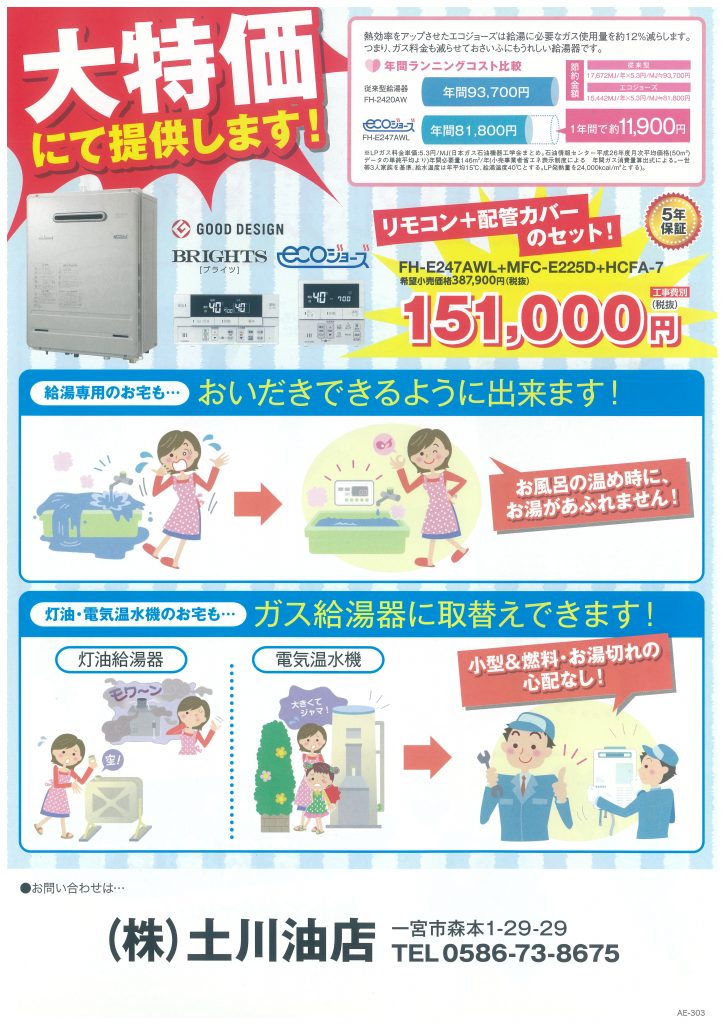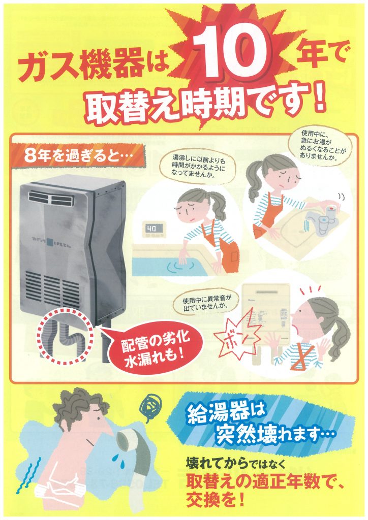 弊社のガス部門(一宮市森本1-29-29)では給湯器の取り換え時期を告知する案内を配布しています。