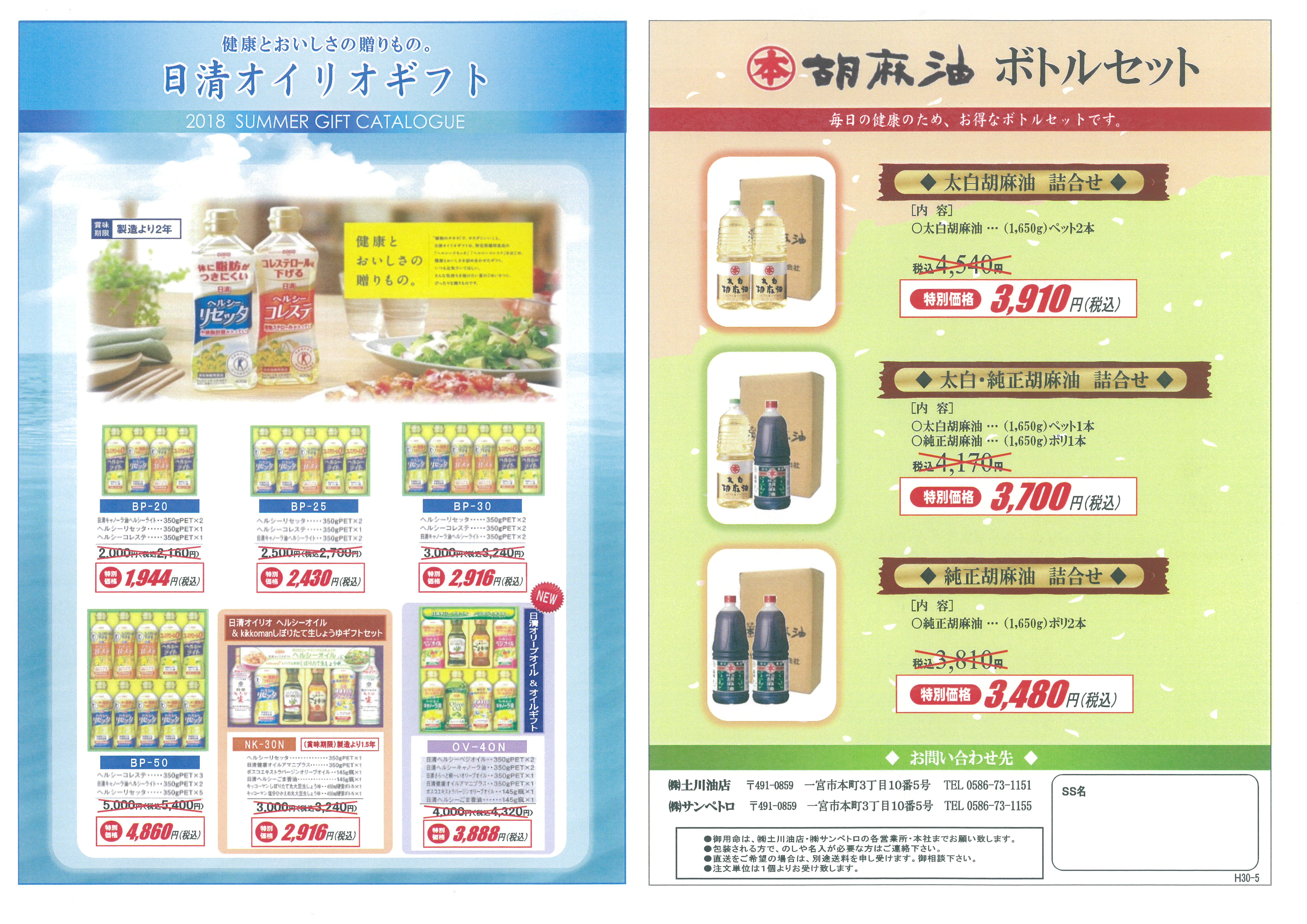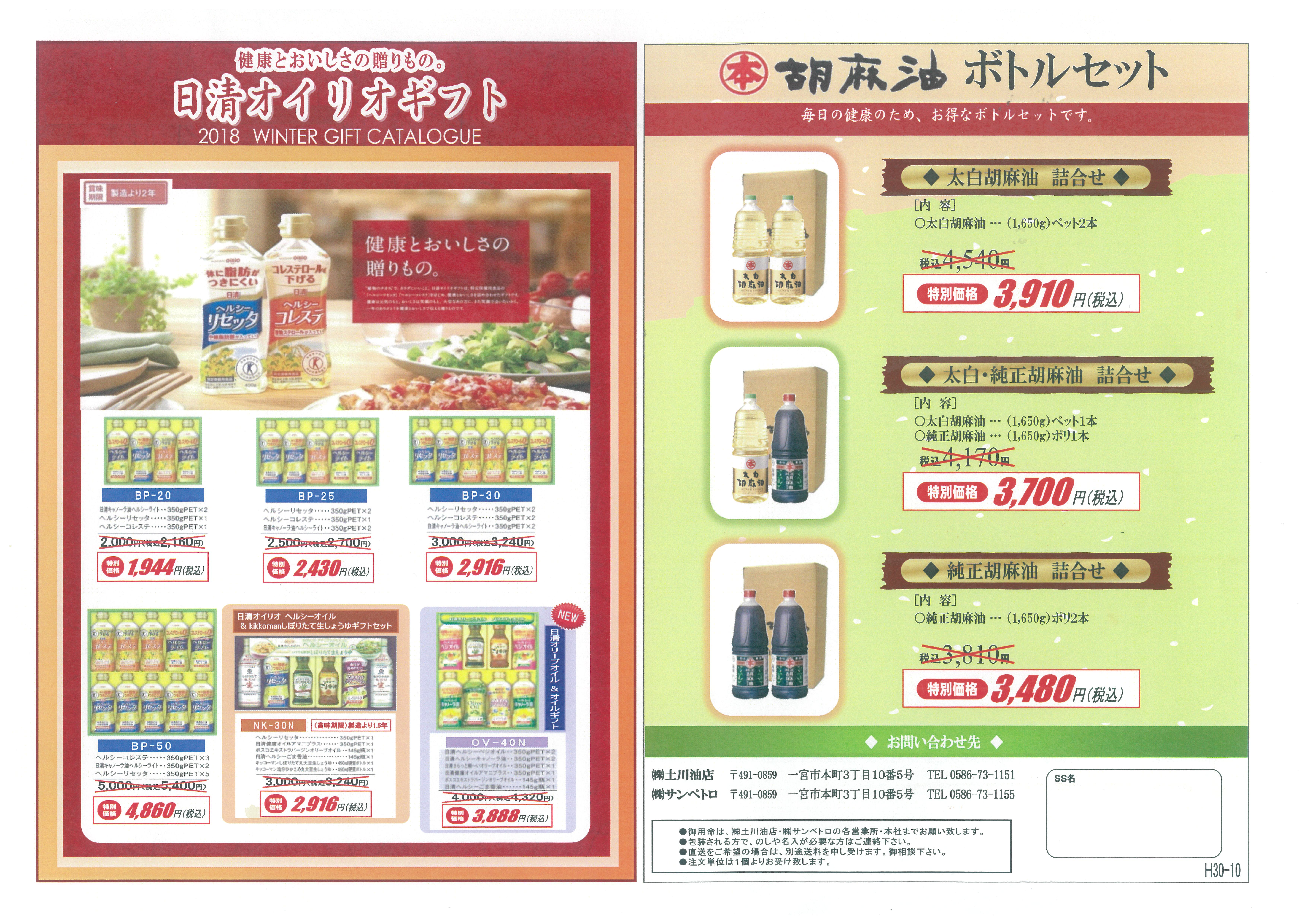 マルホン胡麻油 ギフトセットと日清オイリオギフトセットの案内です。