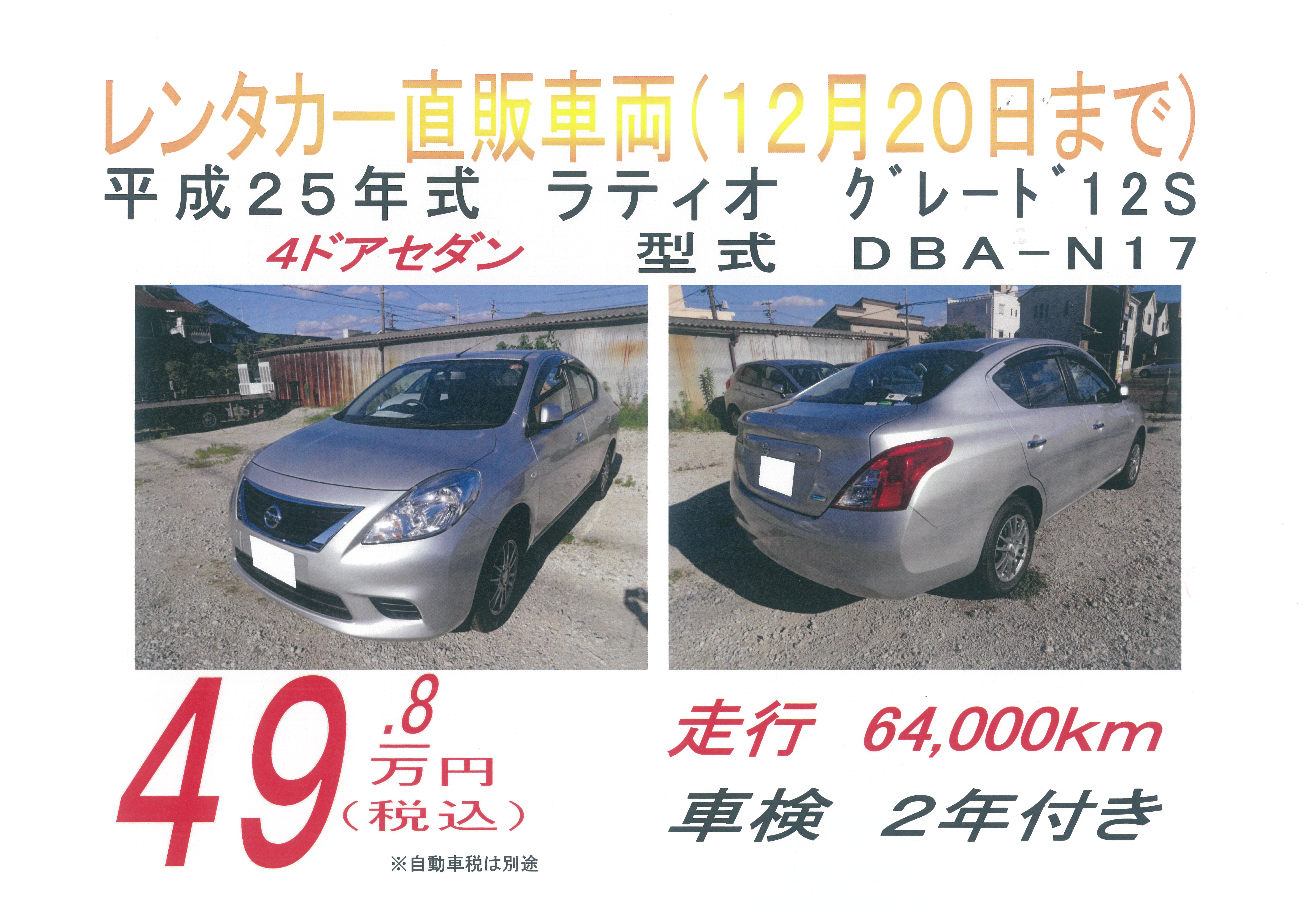 レンタカー特選車両のご案内(日産 ラティオ)~12/20