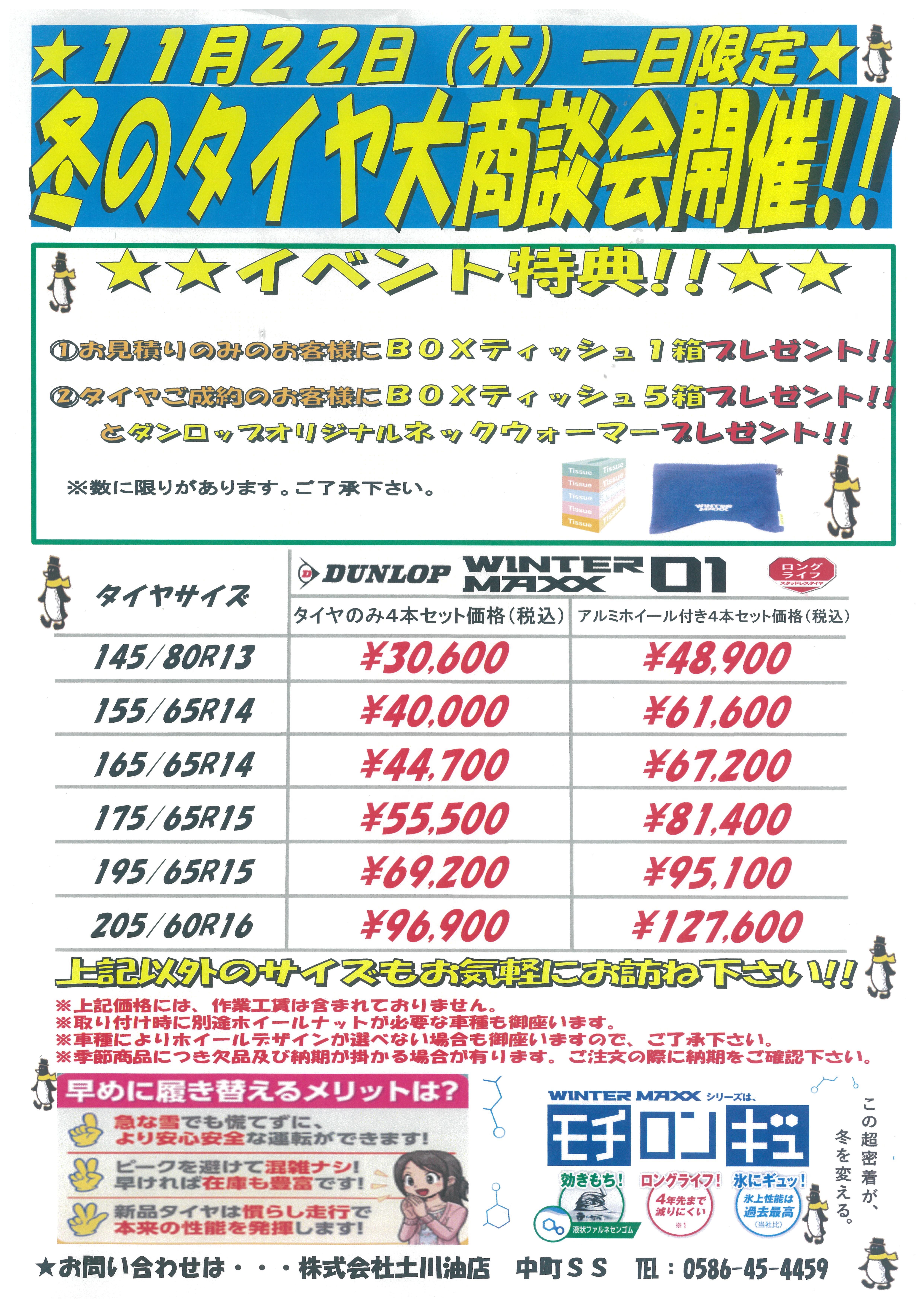 中町サービスステーション(ESSO/一宮市中町2-4-8)では「冬のタイヤ大商談会」と題し11/22(木)スタッドレスタイヤのイベントを開催します。