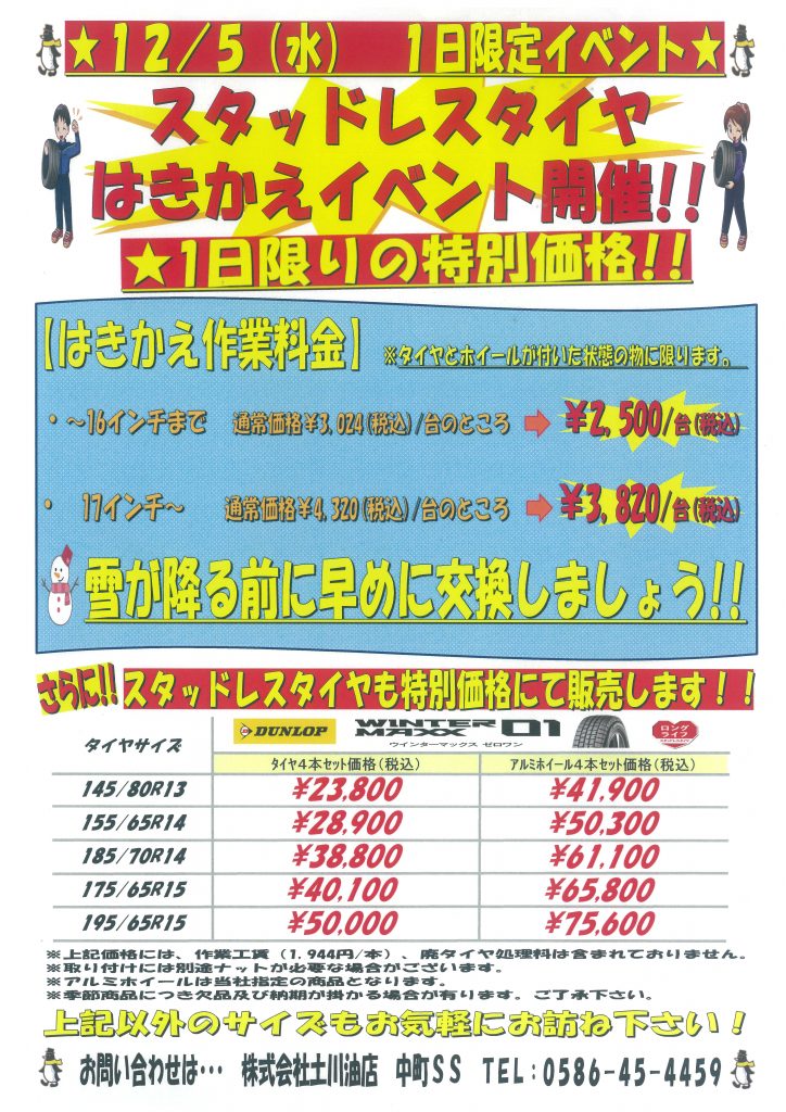 中町サービスステーション(ESSO/一宮市中町2-4-8)では12/5(水)「スタッドレスタイヤ履き替えイベント」と題し、夏タイヤから冬タイヤへの履き替え料金を特別価格とさせて頂きます。