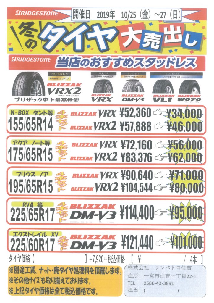 プラスパ住吉サービスステーション(一宮市住吉1-22-1)では、「冬のタイヤ大売り出し」と題し10/25(金)~27(日)までイベントを開催します。