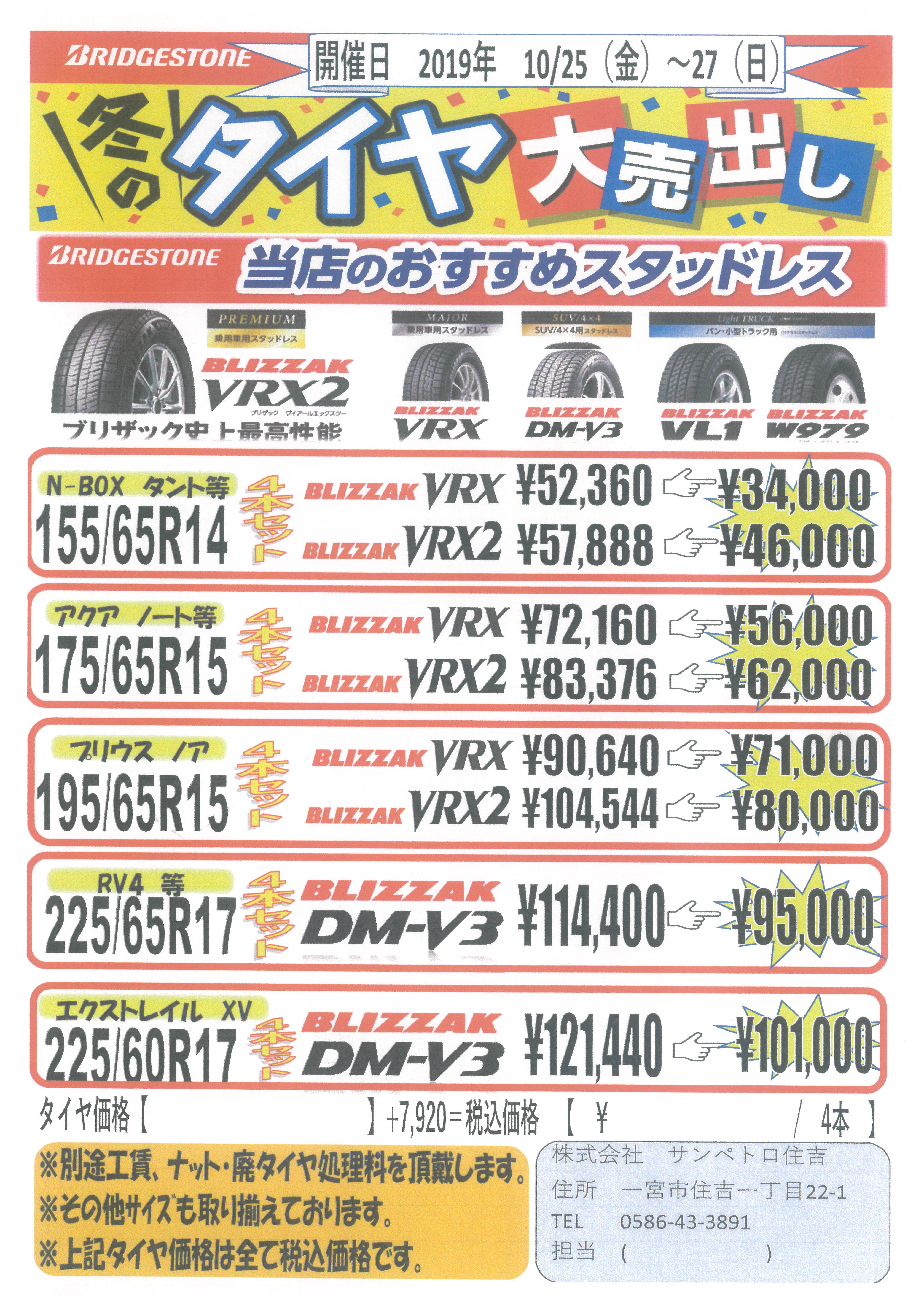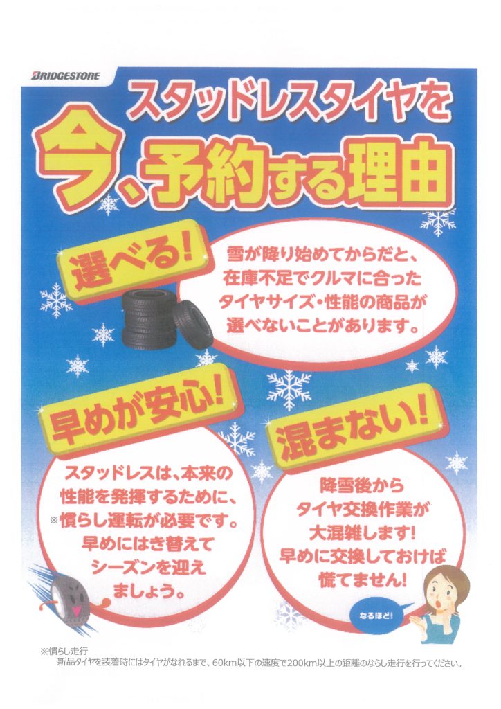 当日はブリヂストンタイヤ様に協力を頂き、スタッドレスタイヤを特価で販売します。また人員も増員して交換作業を行います。