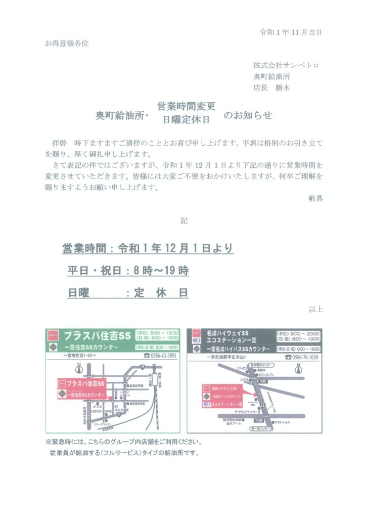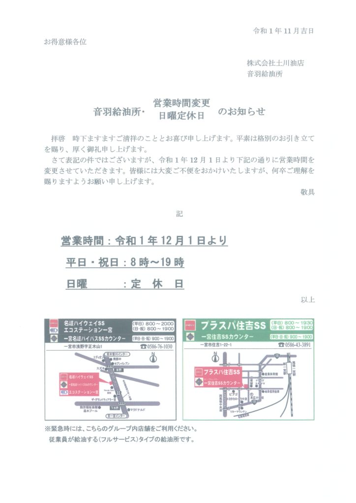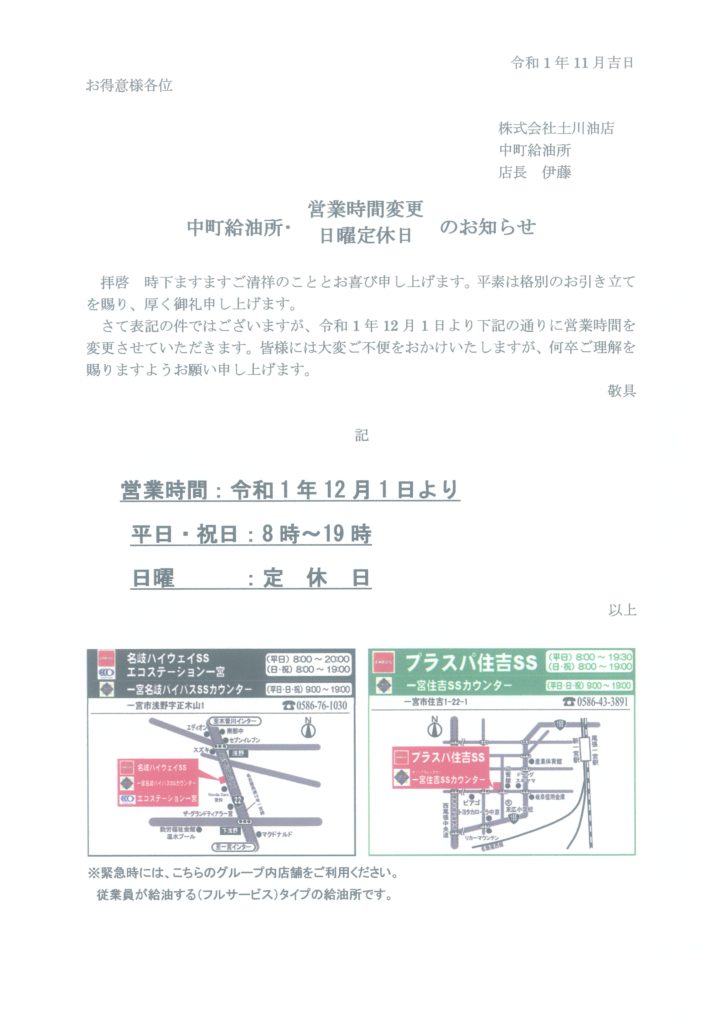弊社下記のサービスステーションの日曜日休業並びに営業時間の変更を行います。