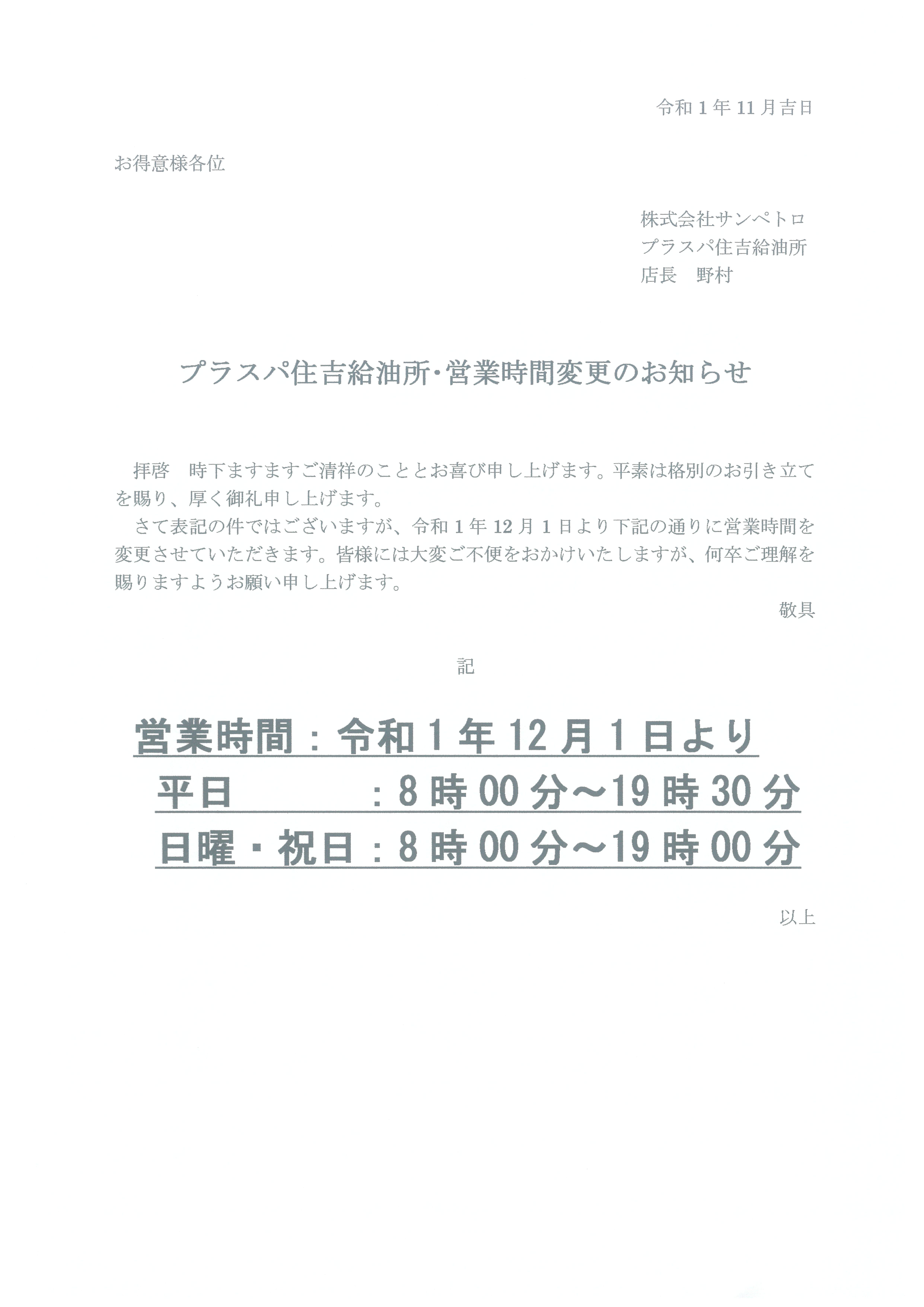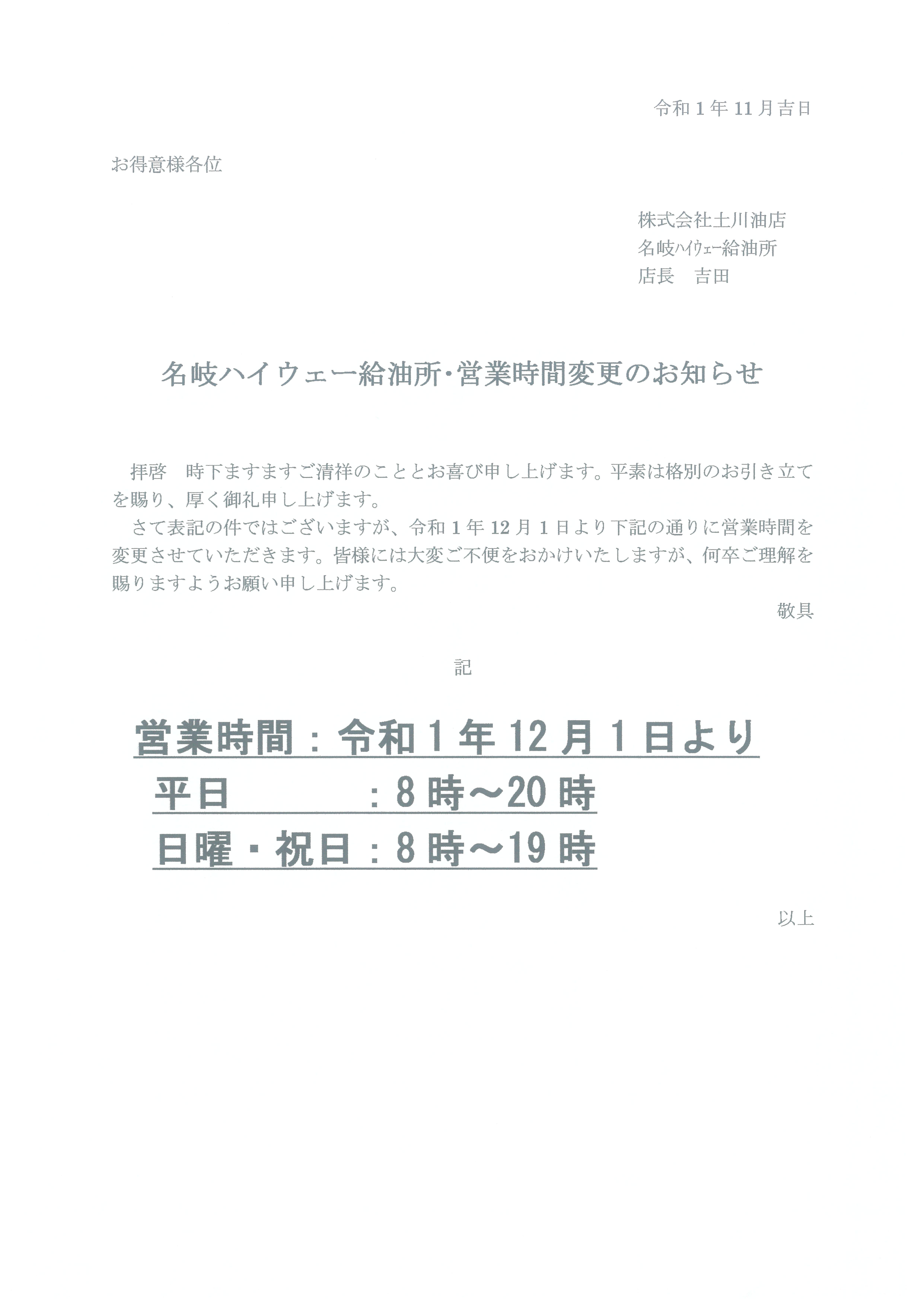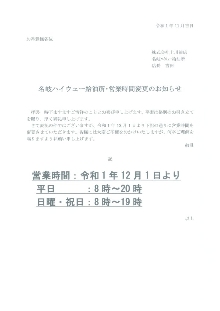 日曜日休業並びに営業時間変更のご案内となります。