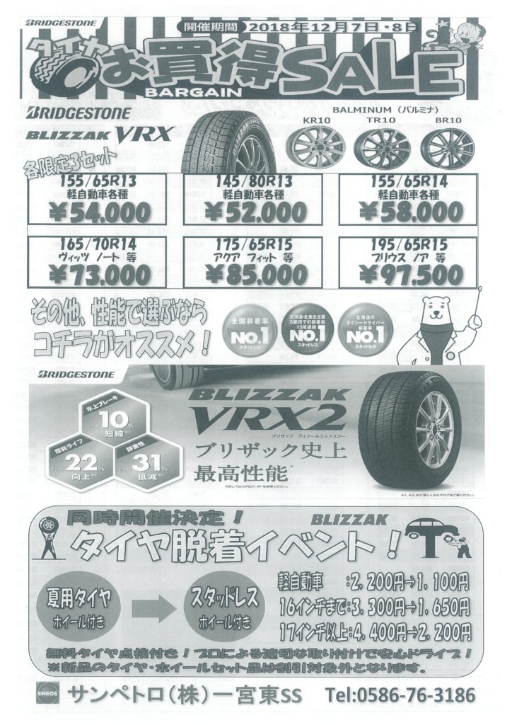 【一宮東サービスステーション】タイヤお買い得セール&脱着イベントのご案内(12/7・8)