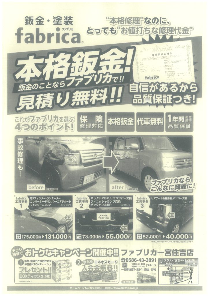 弊社でお車の鈑金塗装の取扱いを行っていることをもっと沢山のお客様に知っていただきたいということで、1月2月は各営業所に”案内”を配布しています。