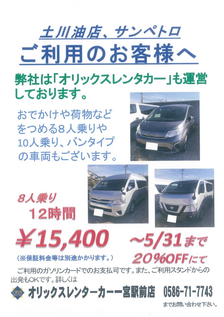 弊社はオリックスレンタカーの営業所を一宮駅前で運営していることをもっと沢山のお客様に知っていただきたいということで、5/31までお客様より直接のご依頼が多い、ワゴン車の案内を各営業所でPRしています。