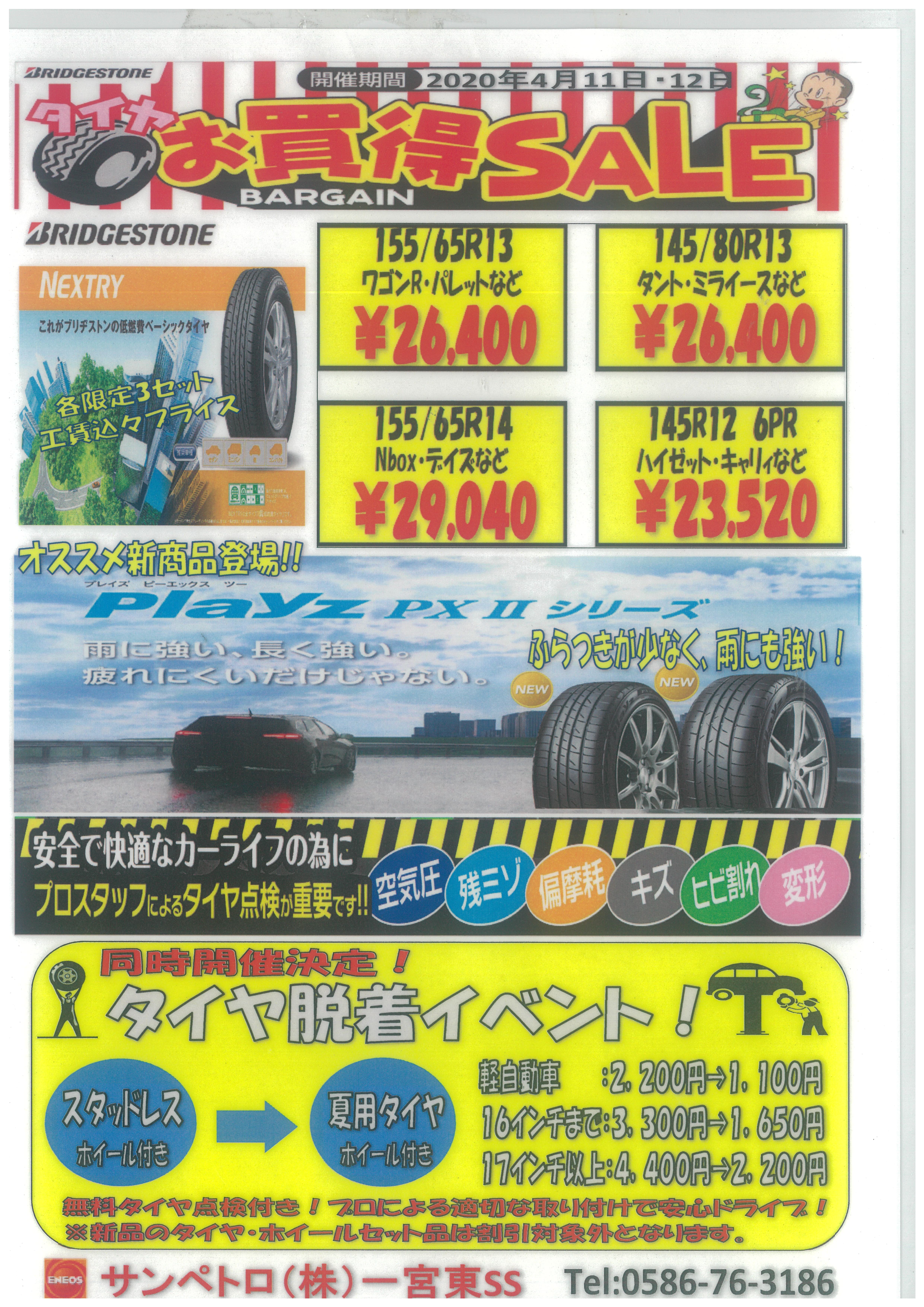 一宮東サービスステーション(浅野字水屋高9-1)では、4/11・12「タイヤの脱着イベント」を開催します。
