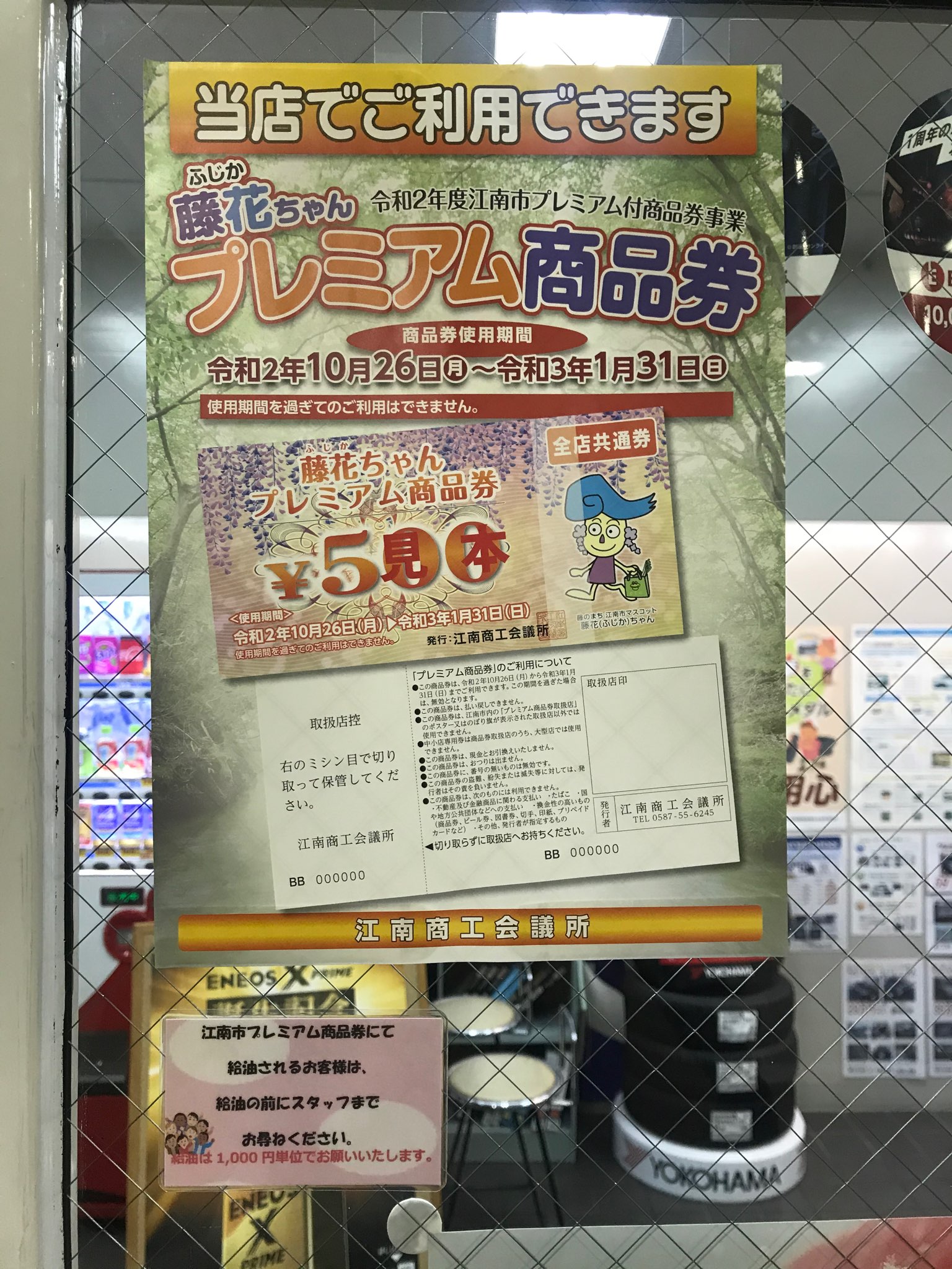 セルフィーユ江南サービスステーション(赤童子良原133)では10/26(月)よりはじまります、江南市プレミアム付商品券事業「藤花ちゃんプレミアム商品券」の取扱いを行っています。