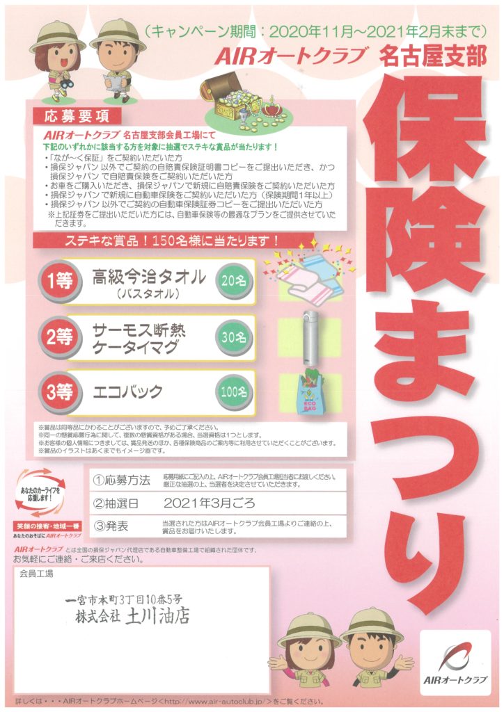 弊社の保険部門(一宮市本町3-10-5)では損保ジャパンのAIRオートクラブの「保険まつり」に参加しています。