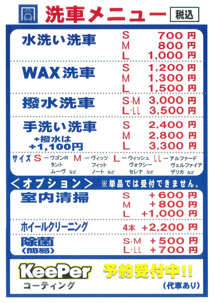 洗車メニューも一新させていただきました。