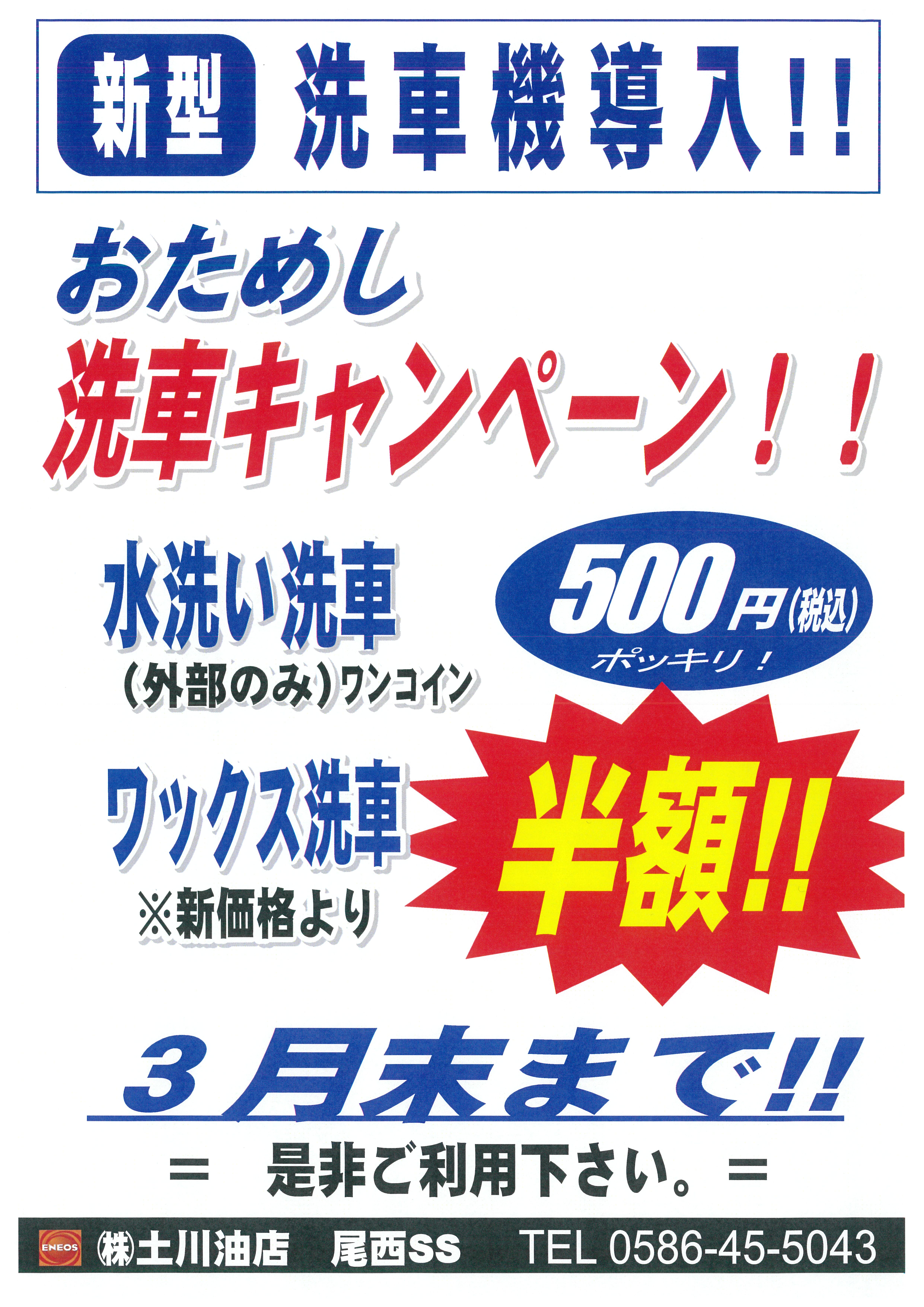 店長も「今までの洗車機より最新型に進化し洗浄力も向上しました。ただ今、3月末までおためし価格でのキャンペーン実施中です。水洗いワンコイン(500円)ワックス洗車半額!是非、お試しください‼︎」