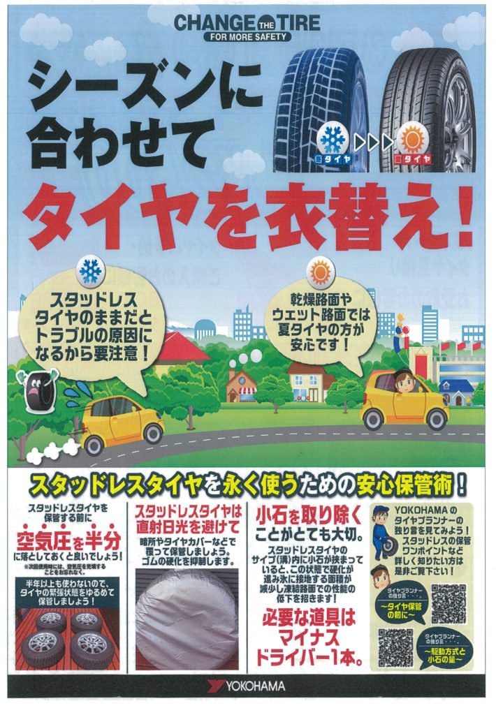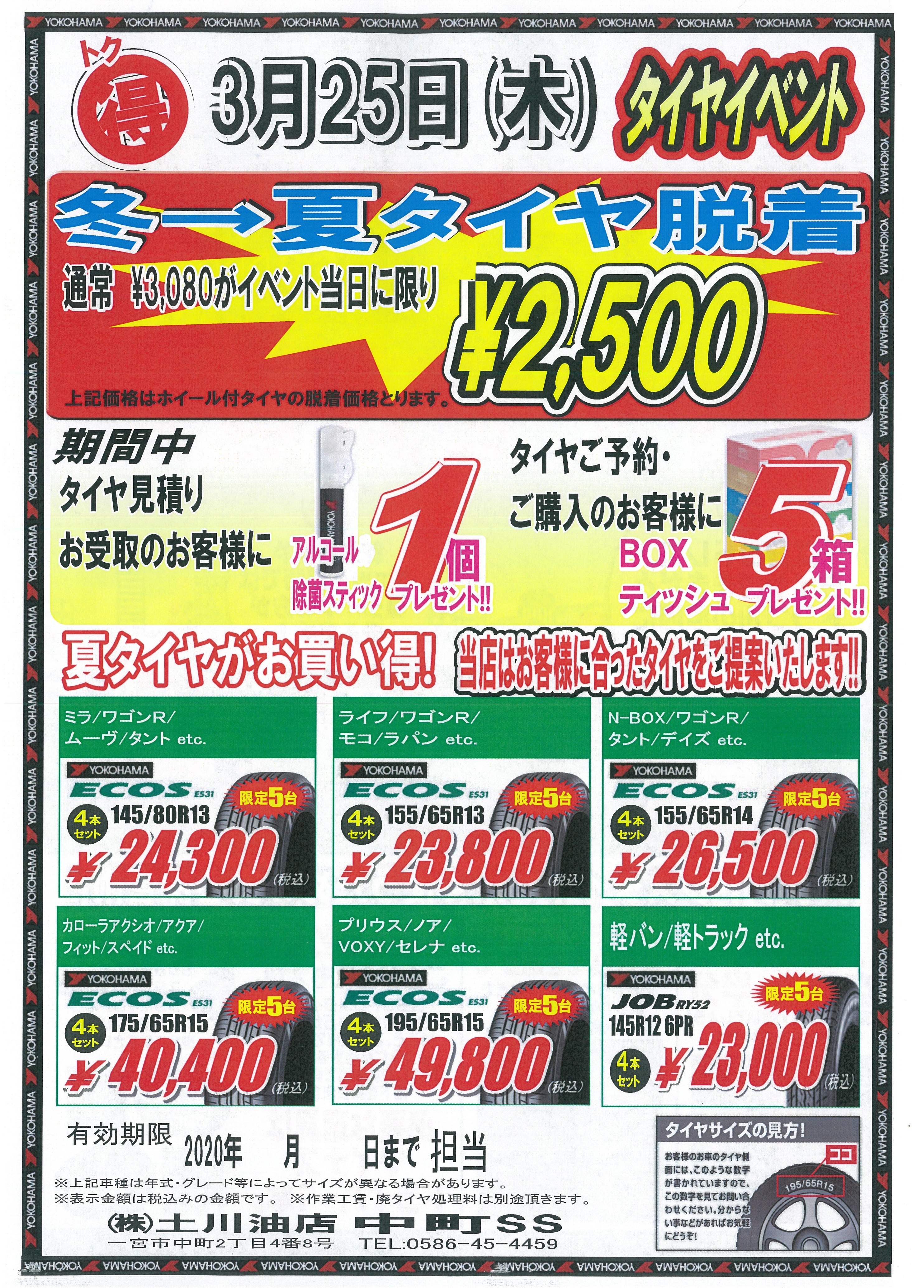 【中町サービスステーション】冬→夏タイヤ脱着 タイヤイベントのご案内(3/25)
