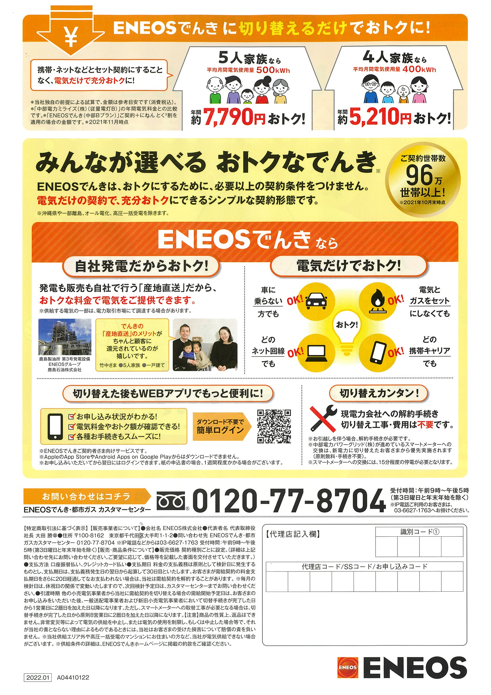本年も新型コロナウィルス感染症の影響を受け、移動には厳しい1年でしたが、そんな中でも「ENEOSでんき」や「ENEOSカーリース」など新しい事業にも取り組むことが出来ました。来年以降もお客様にご紹介させて頂ければと考えています。