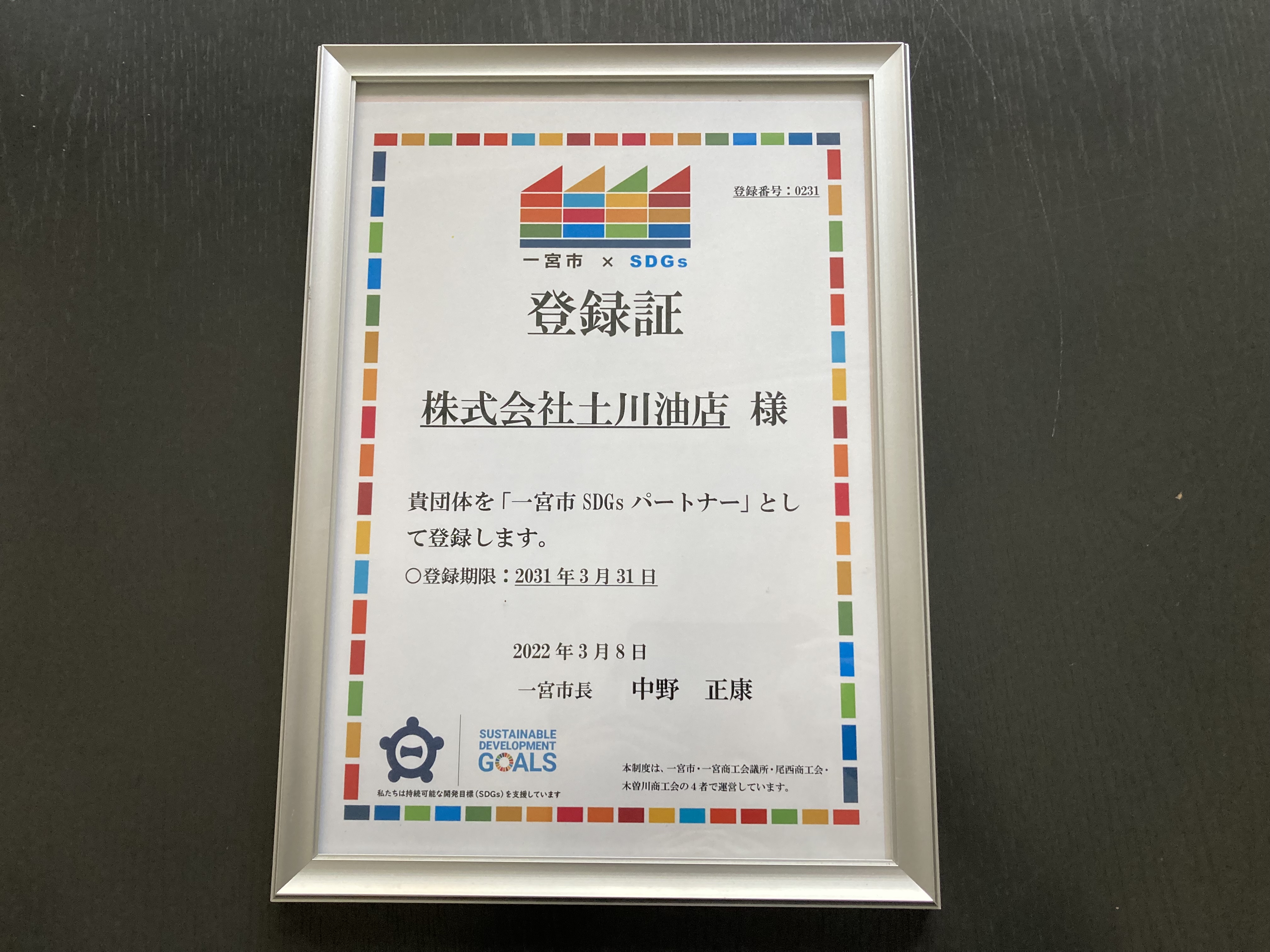 一宮市SDGsパートナー制度に応募させていただき登録証を頂きました。