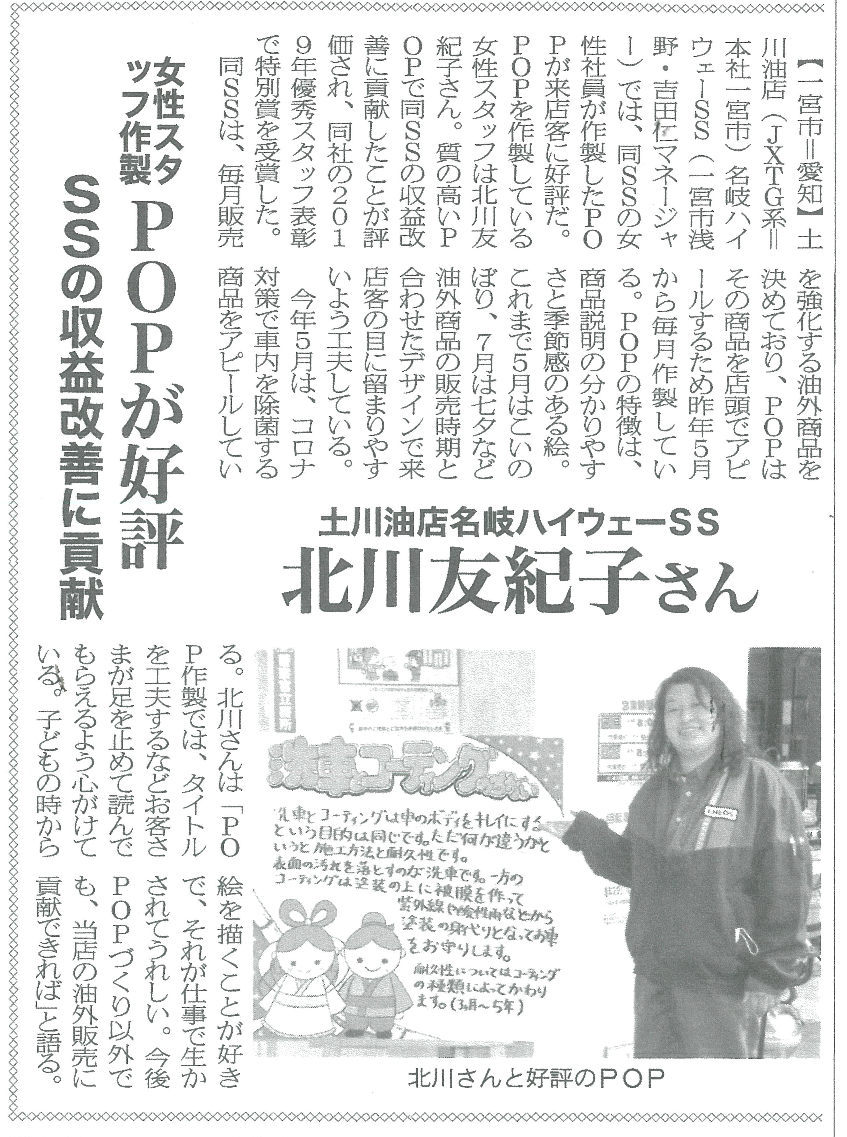 石油業界の新聞ではありますが弊社名岐ハイウェイサービスステーション(一宮市大字浅野字正木山1)のスタッフが燃料油脂新聞に掲載されましたので紹介します。