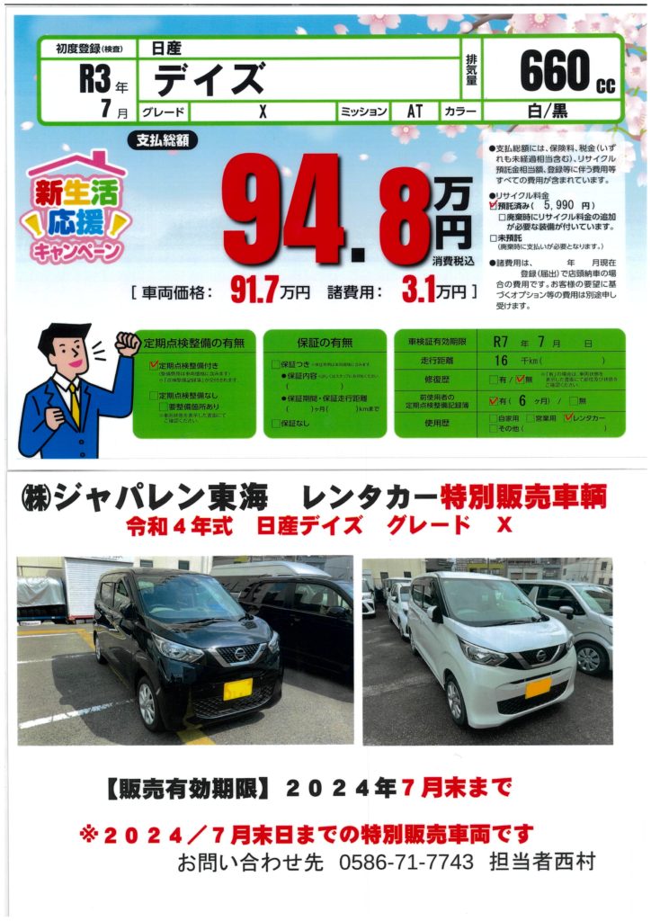 新車で購入しレンタカーで使用していた期間は、弊社が責任をもってメンテナンスしておりましたので、お客様に自信をもってしかもお値打ちにお勧めさせていただきます。