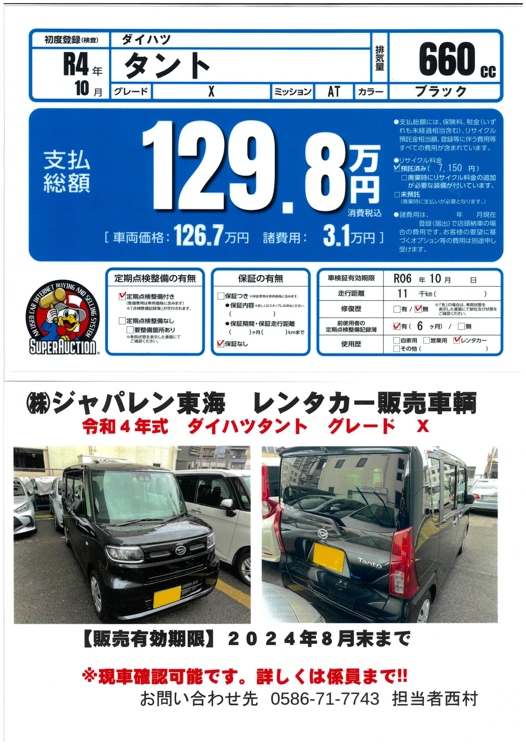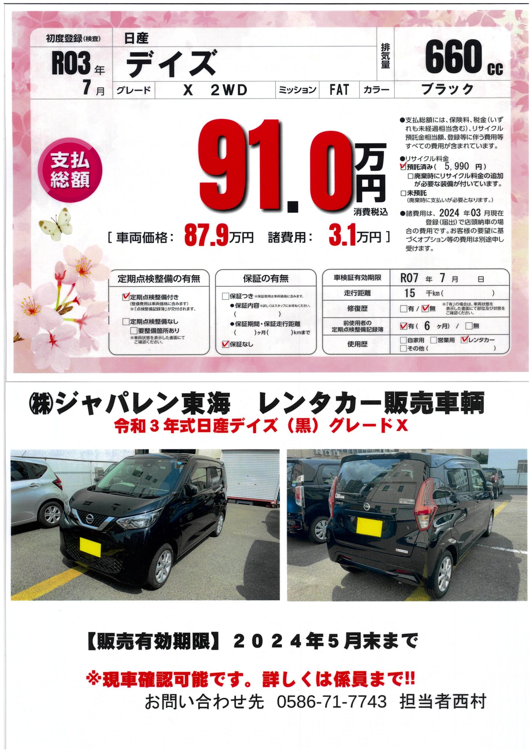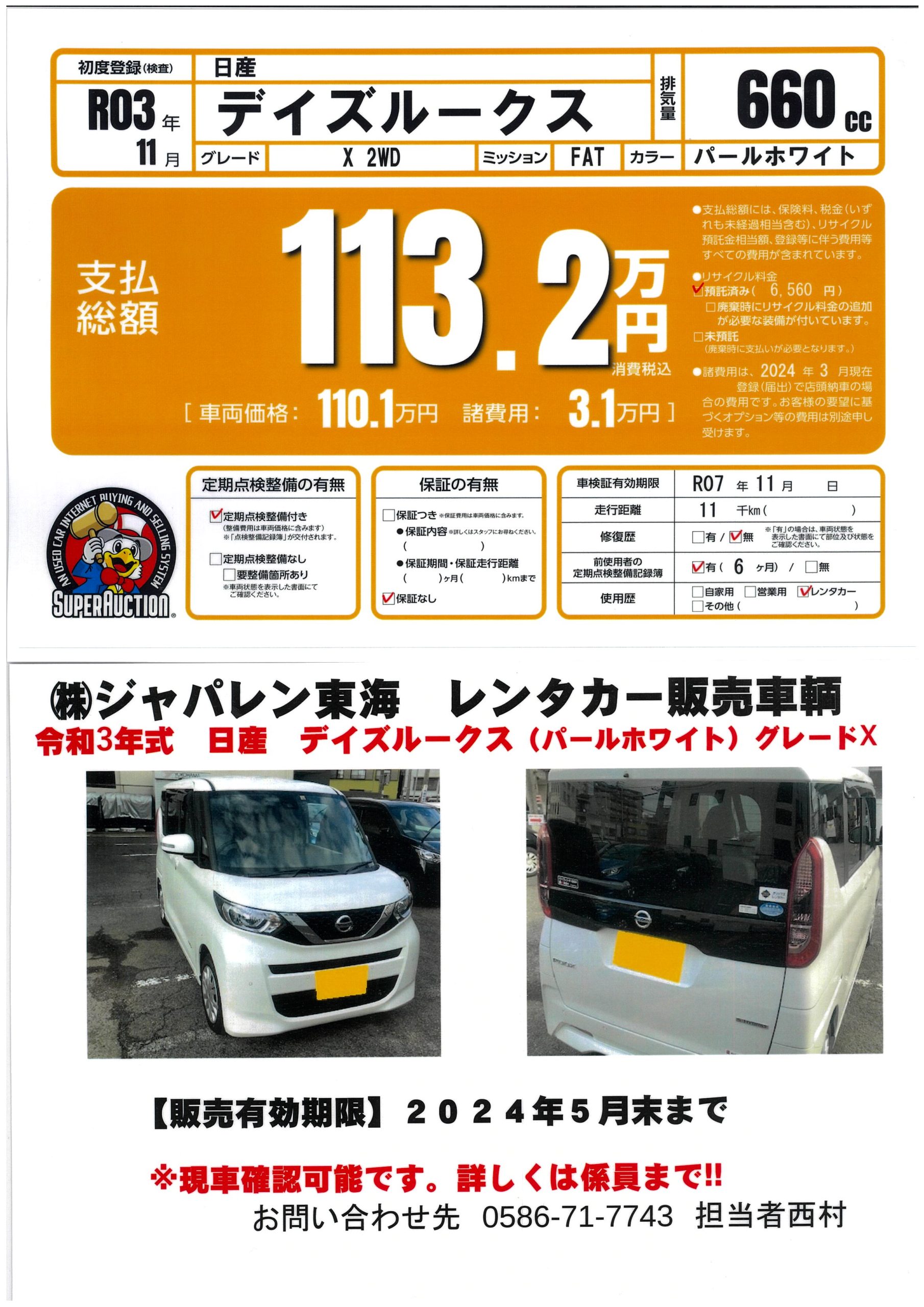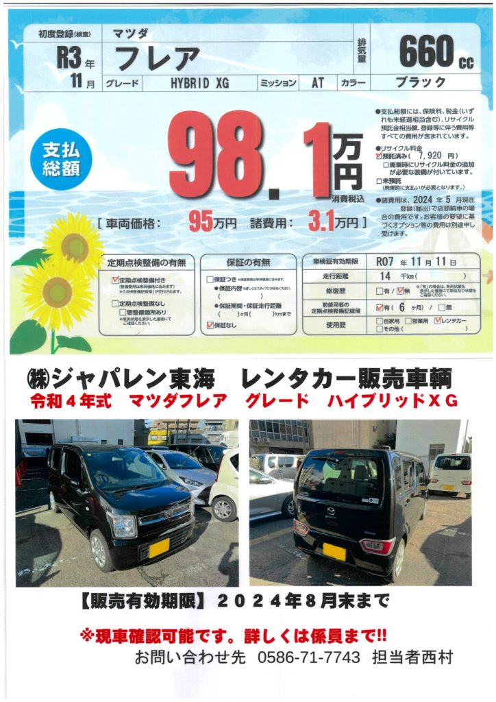 新車で購入しレンタカーで使用している期間は、弊社が責任をもってメンテナンスしておりましたので、お客様に自信をもってお勧めさせていただきます。