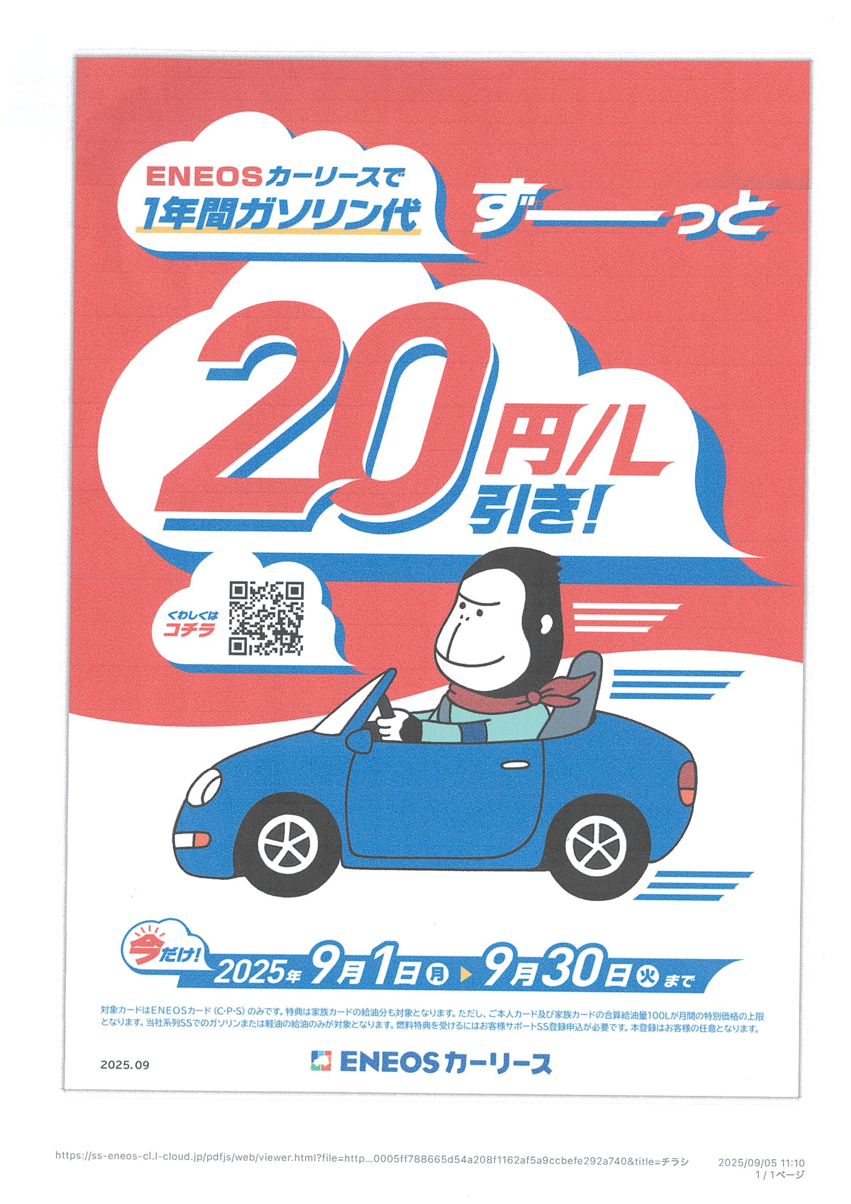 詳しくはこちらのENEOSのサイトをご確認下さい→ENEOSカーリース 1年間ガソリン代20円/L引きキャンペーン | ENEOSカーリース
